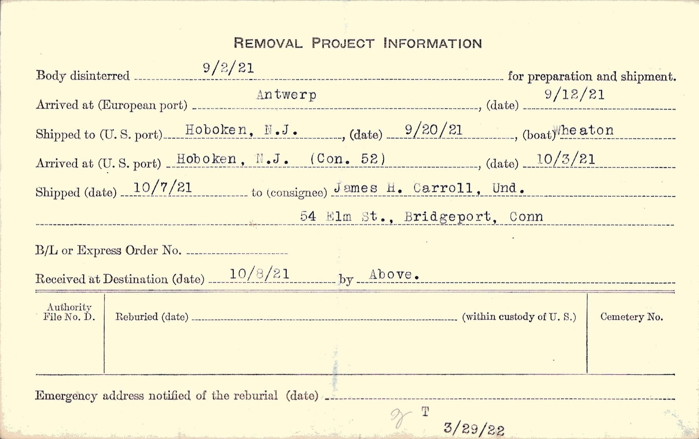 Body disinterred 9/2/1921 for preparation and shipment.