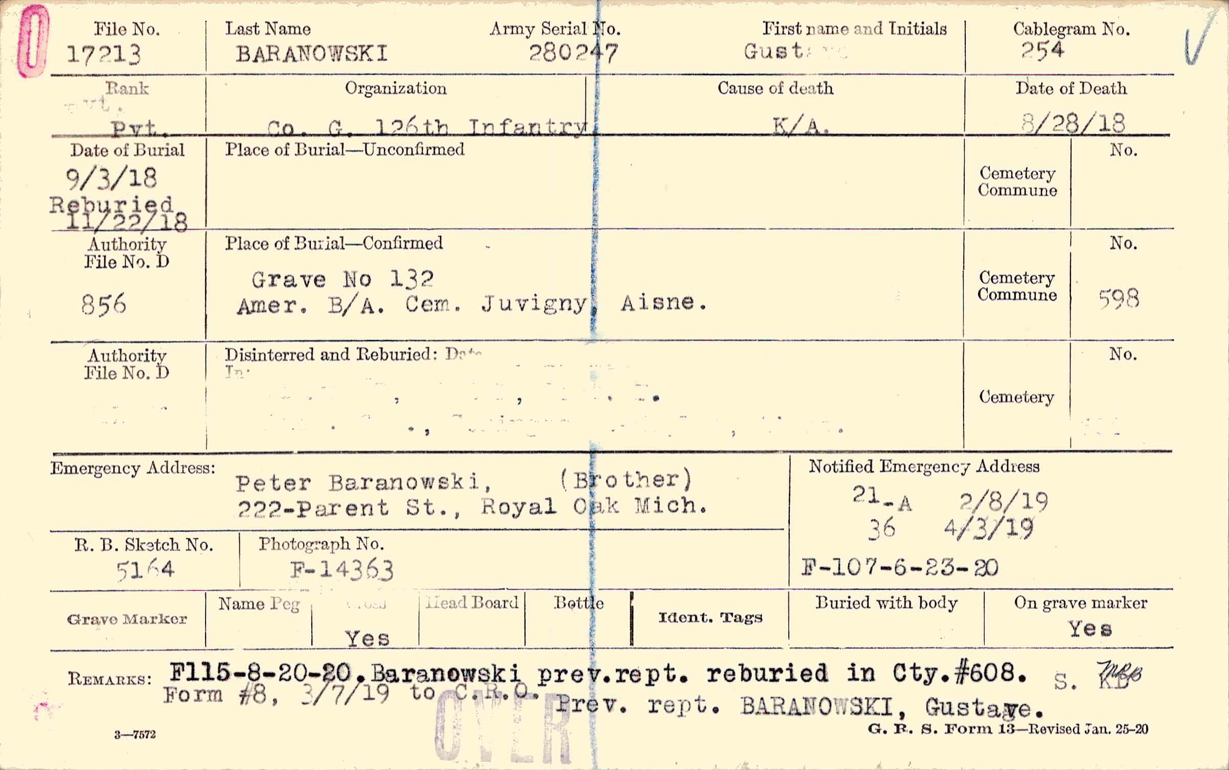 Baranowski prev. rept. reburied in Cty. #608 Prev. rept. BARANOWSKI, Gustave., Form #8, 3/7/19 to C.R.O., F115-8-20-20.