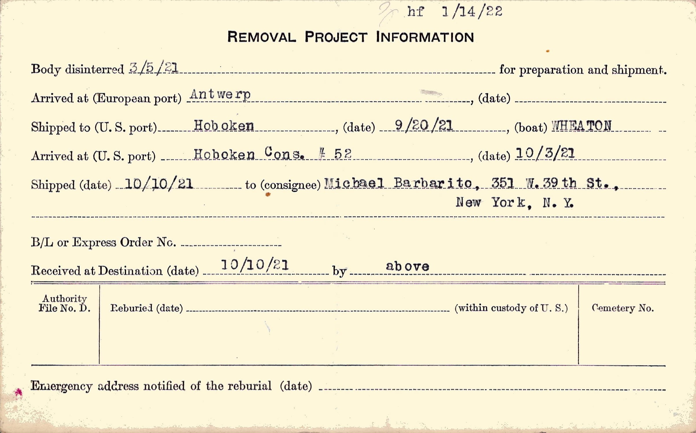 Body disinterred 3/5/1921 for preparation and shipment.