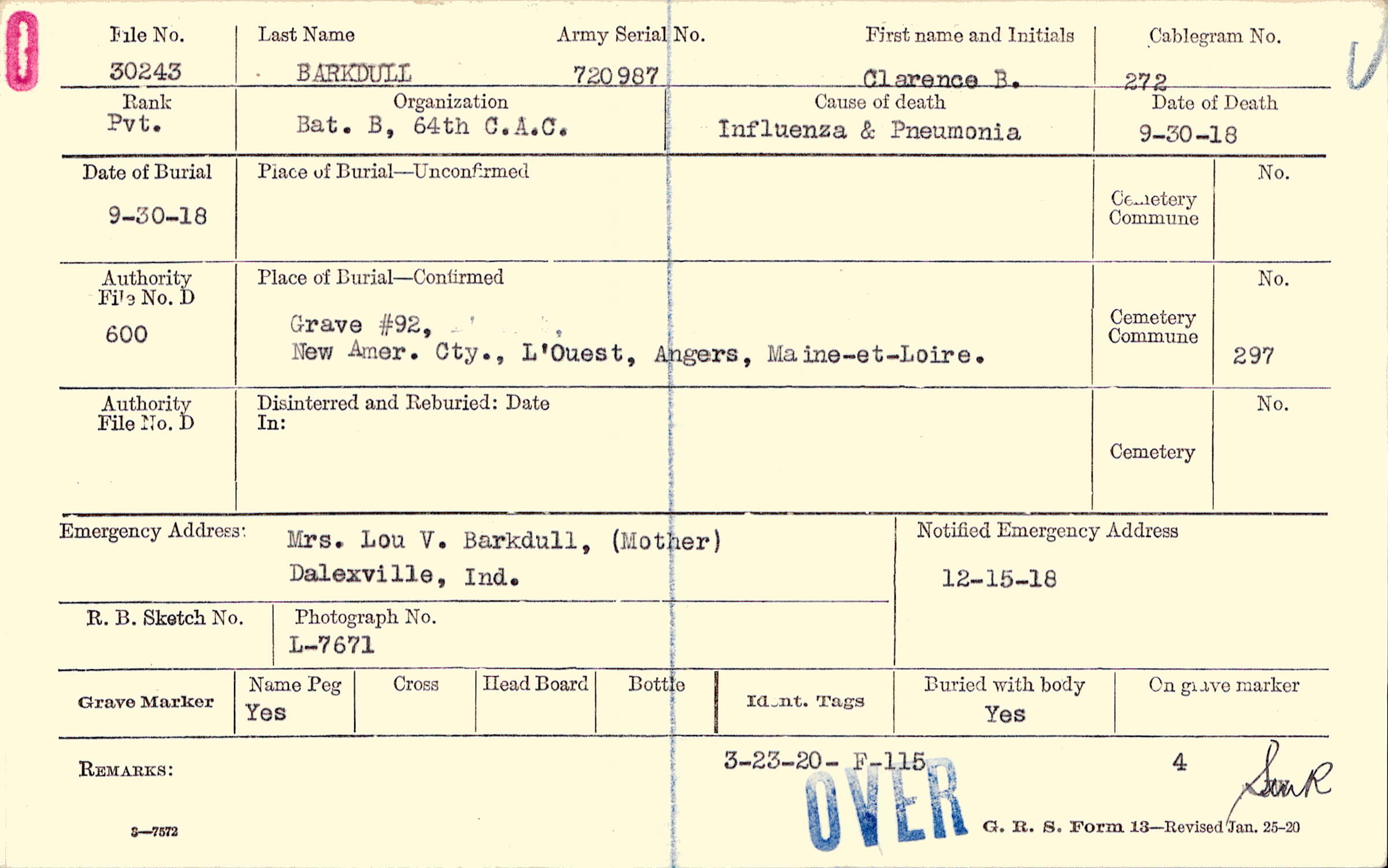 Grave #92, New Amer. Cty., L'Ouest, Angers, Maine-et-Loire.