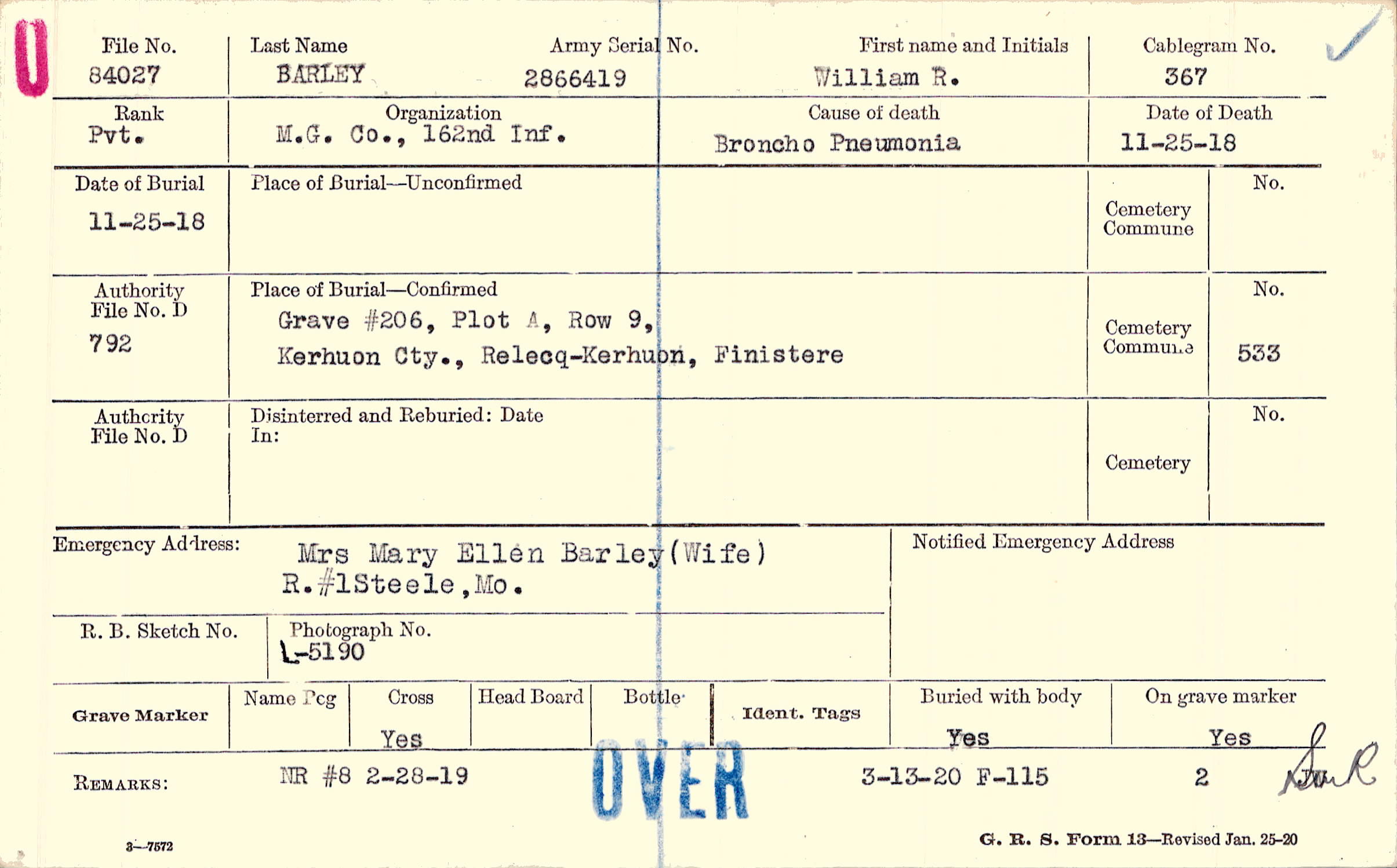 Grave #206, Plot A, Row 9,Kerhuon Cty., Relecq-Kerhuon, Finistere