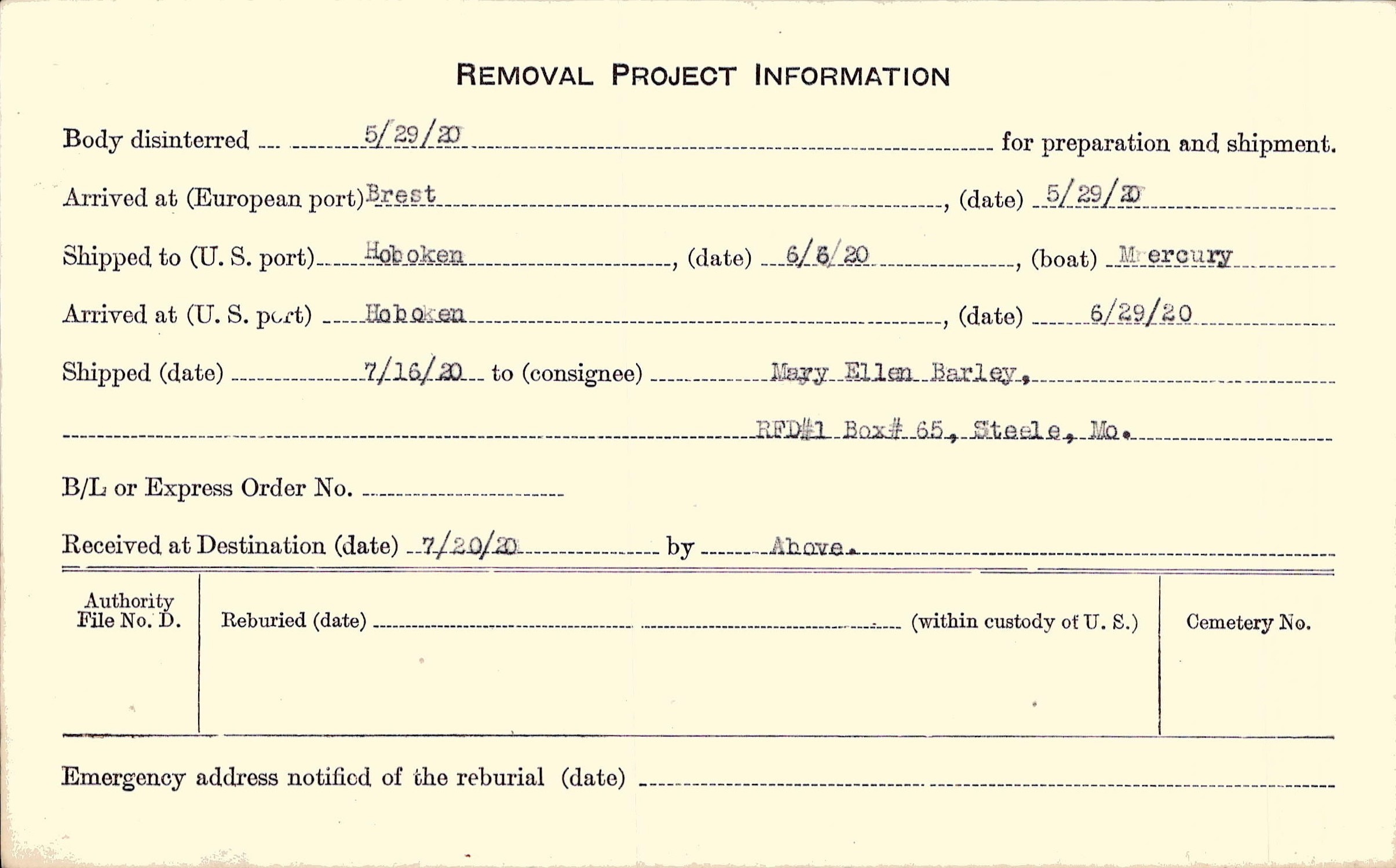 Body disinterred 5/29/1920 for preparation and shipment.