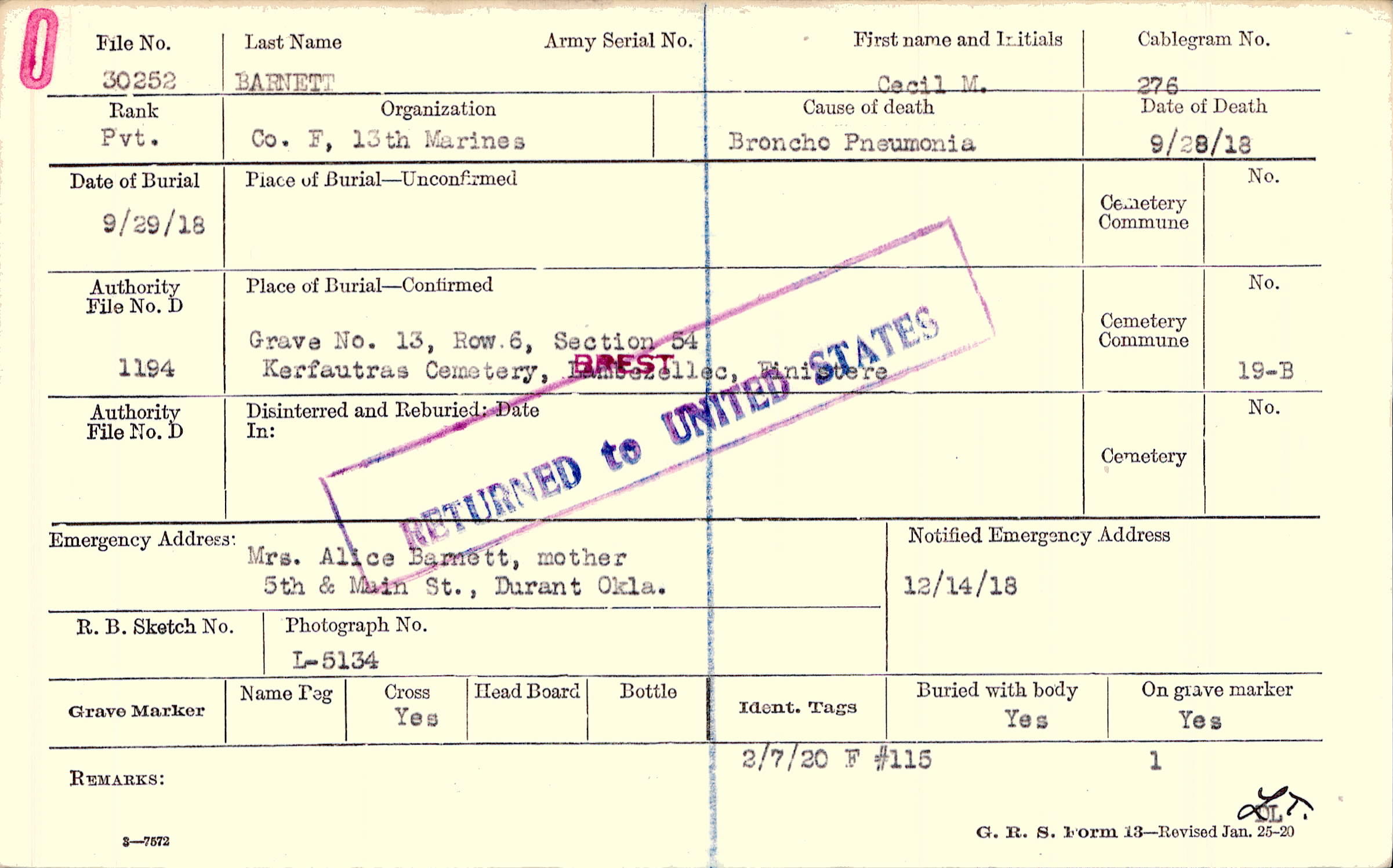 Mrs. Alice Barnett, mother, 5th & Main St., Durant Okla.