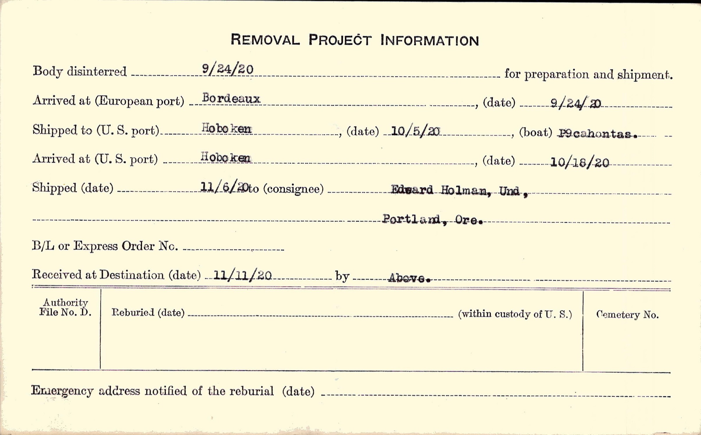 Body disinterred 9/24/1920 for preparation and shipment.