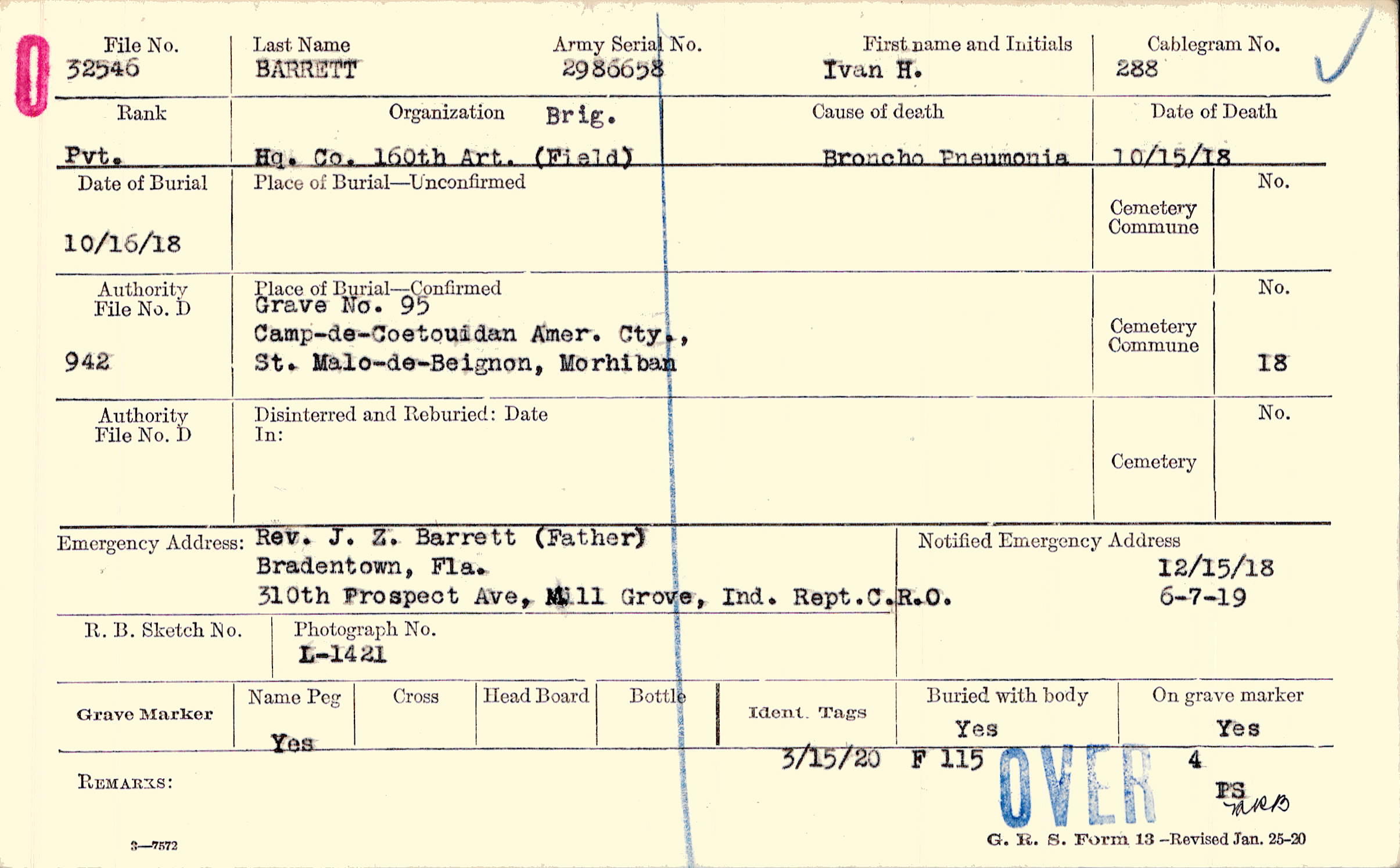 Rev. J. Z. Barrett (Father), Bradentown, Fla. 310th Prospect Ave, Mill Grove, Ind. Rept.C.R.O., 310th Prospect Ave, Mill Grove, Ind. Rept.C.R.O.