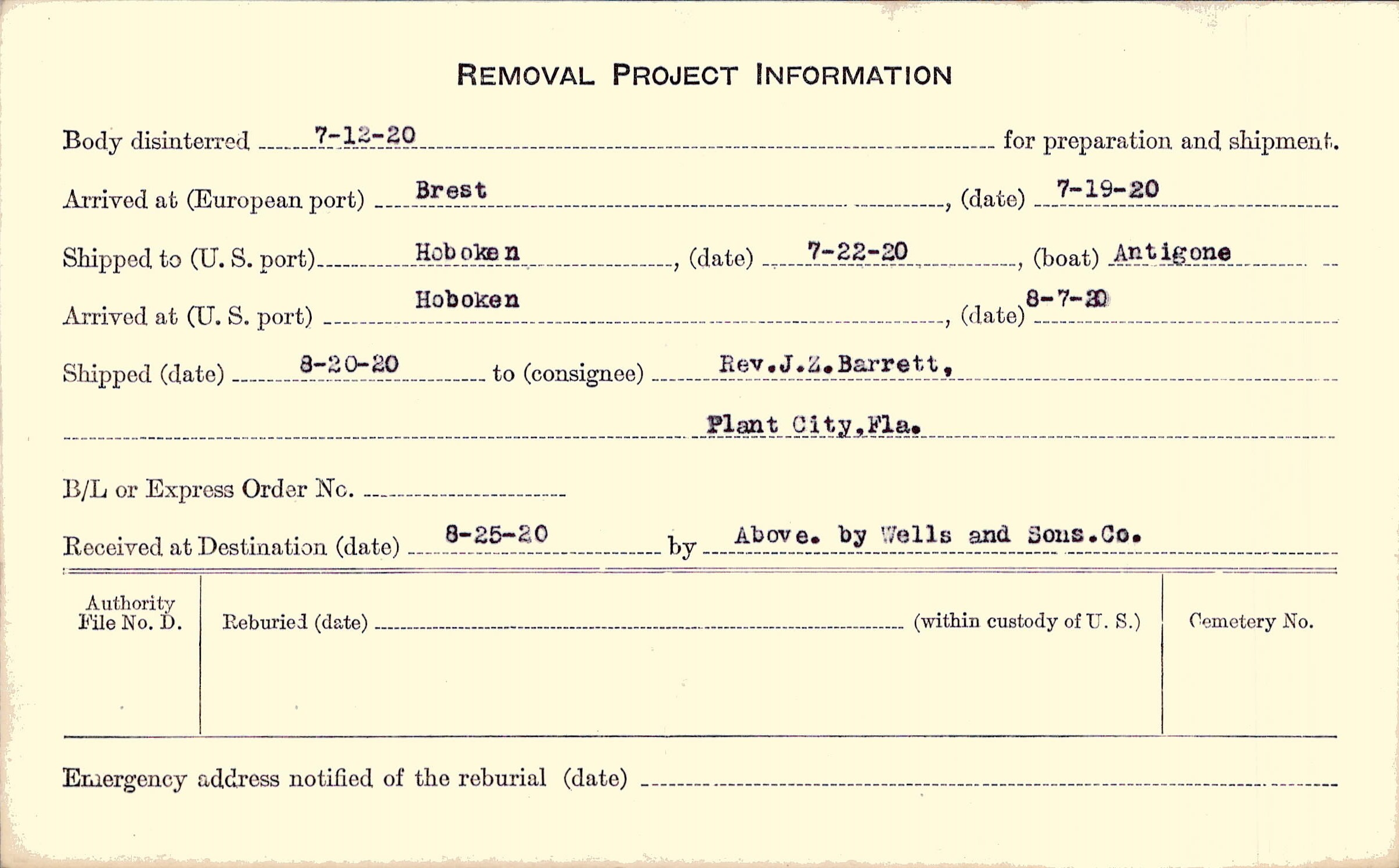 Body disinterred 7/12/1920 for preparation and shipment.