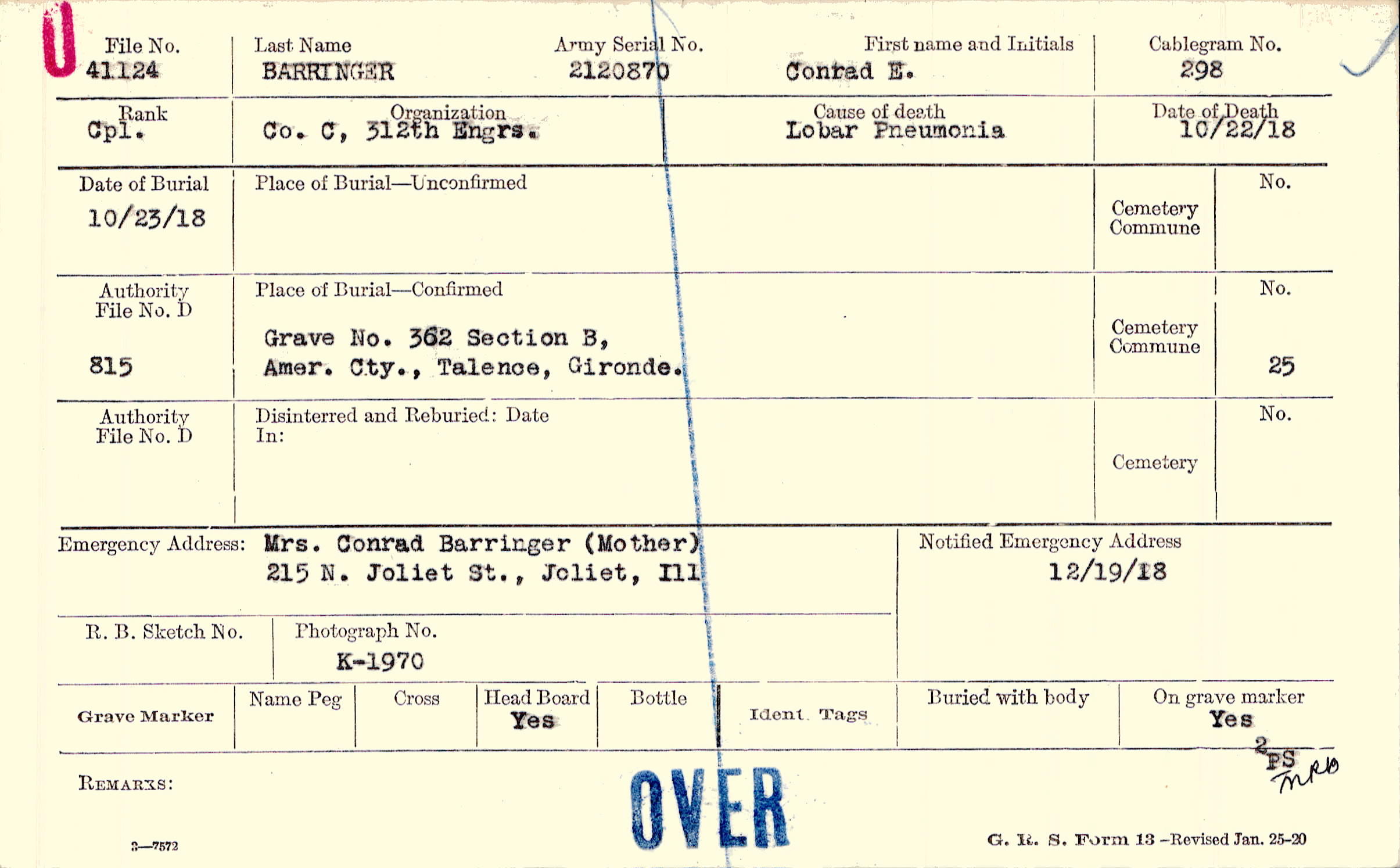 Mrs. Conrad Barringer (Mother), 215 N. Joliet St., Joliet, Ill