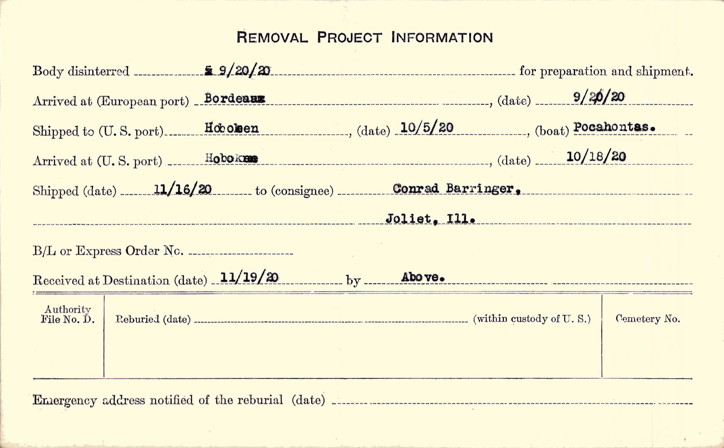 Body disinterred 9/20/1920 for preparation and shipment.
