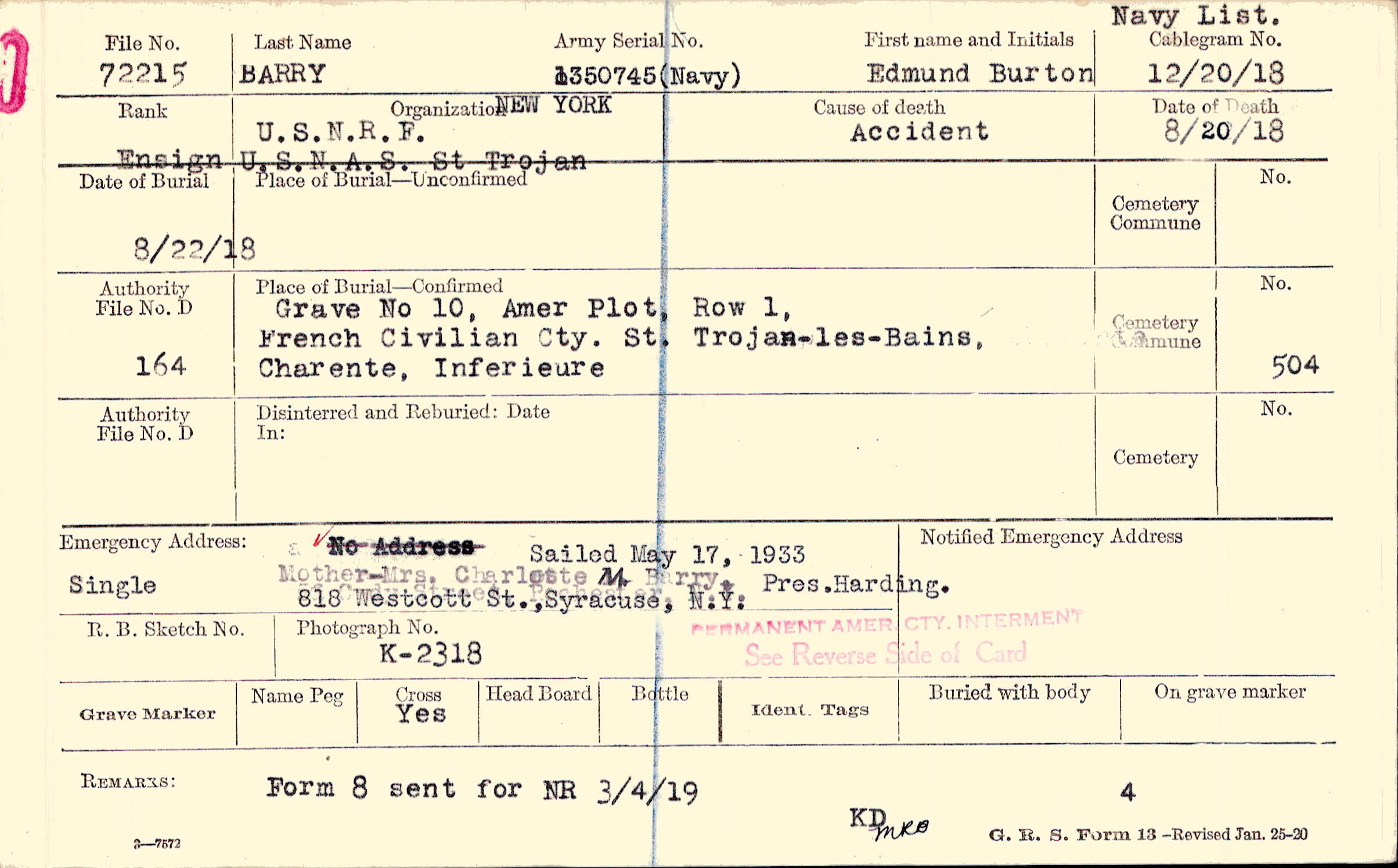 Mrs. Charleste M. Barry, Mother, 818 Westcott St., Syracuse, N. Y., Single Sailed May 17, 1933 Pres. Harding
