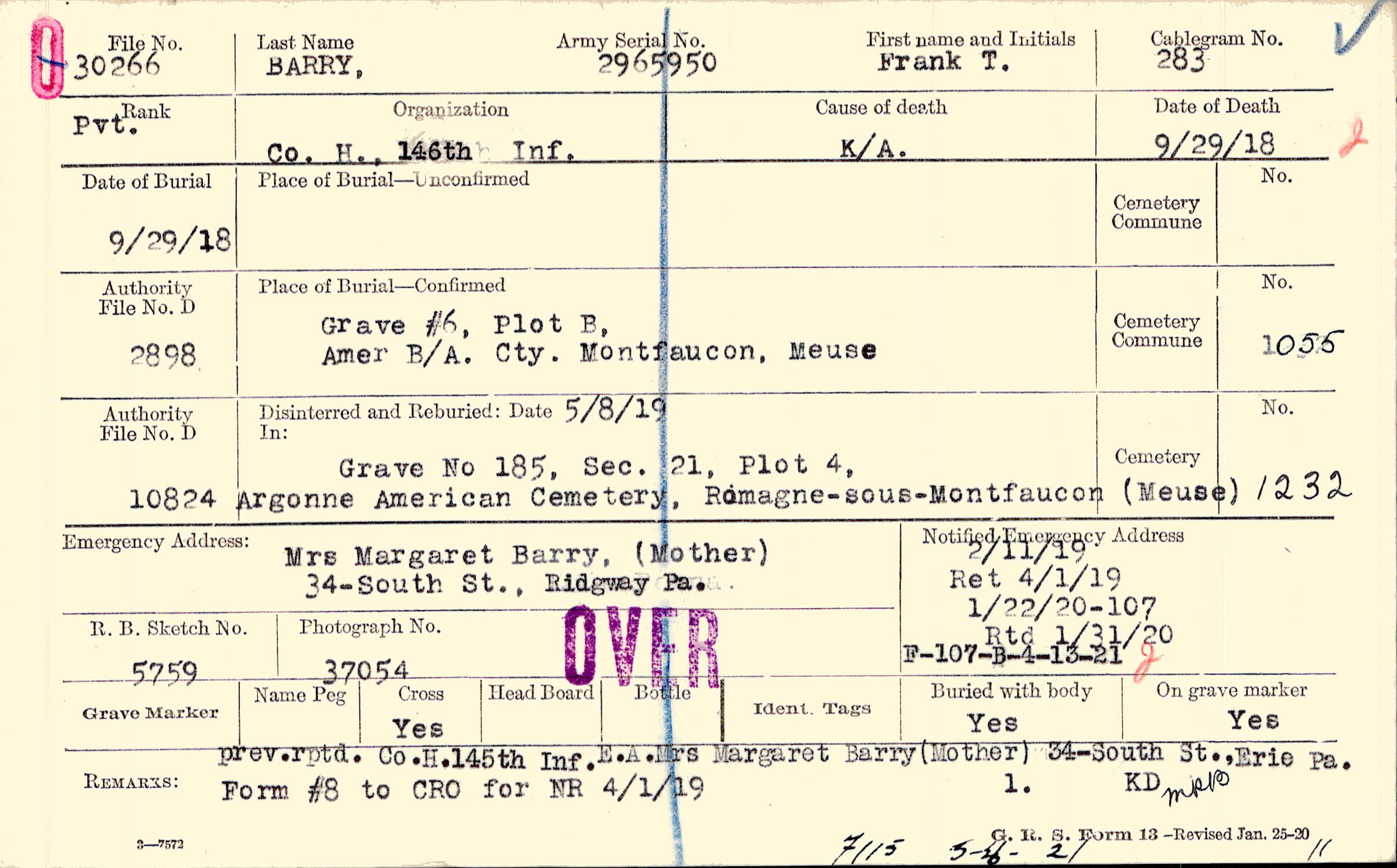 prev. rptd. Co. H. 145th Inf. E.A. Mrs. Margaret Barry (Mother) 34 South St., Erie Pa., Form #8 to CRO for NR 4/1/19, F115 5-26-21 11