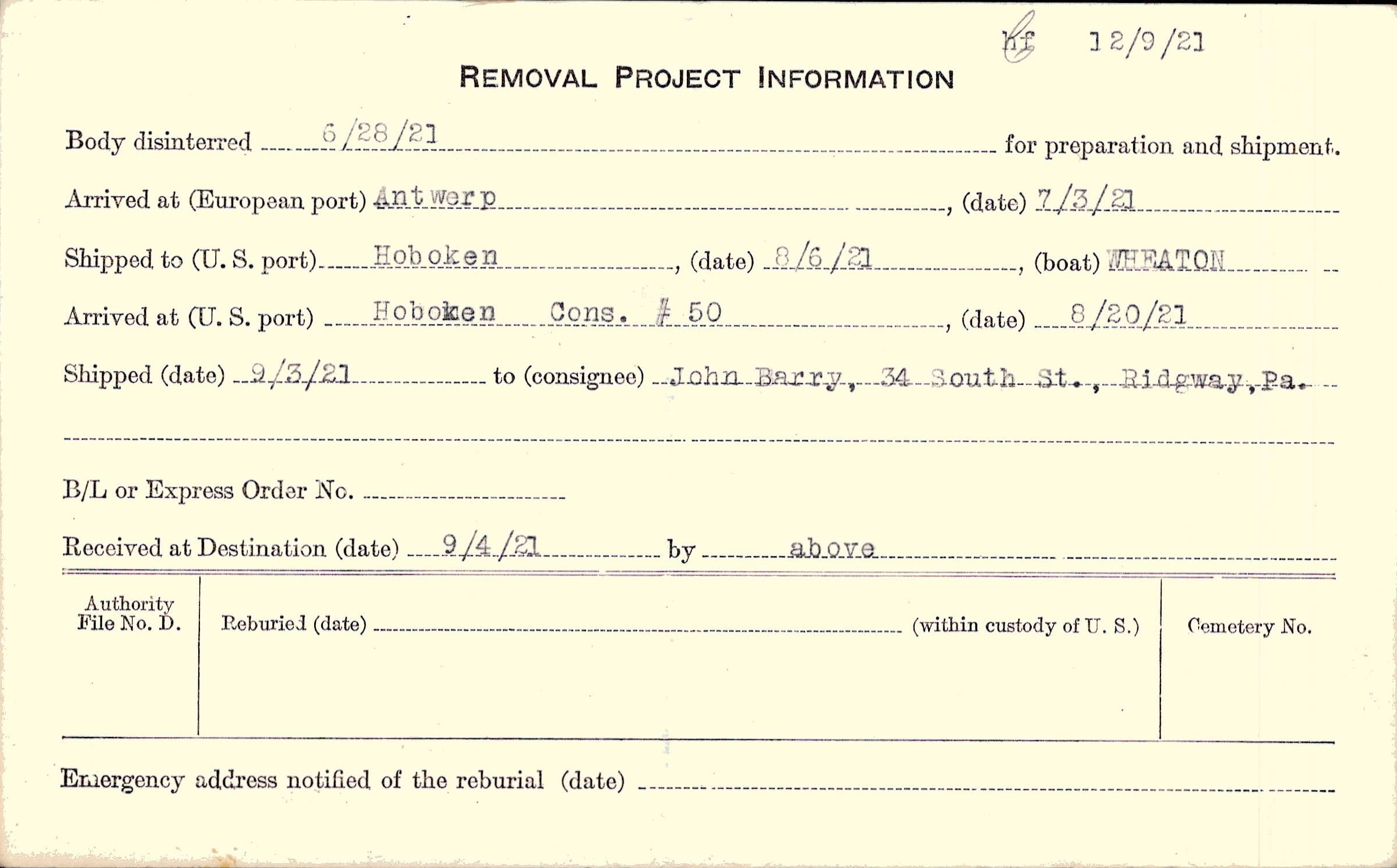 Body disinterred 6/28/1921 for preparation and shipment.