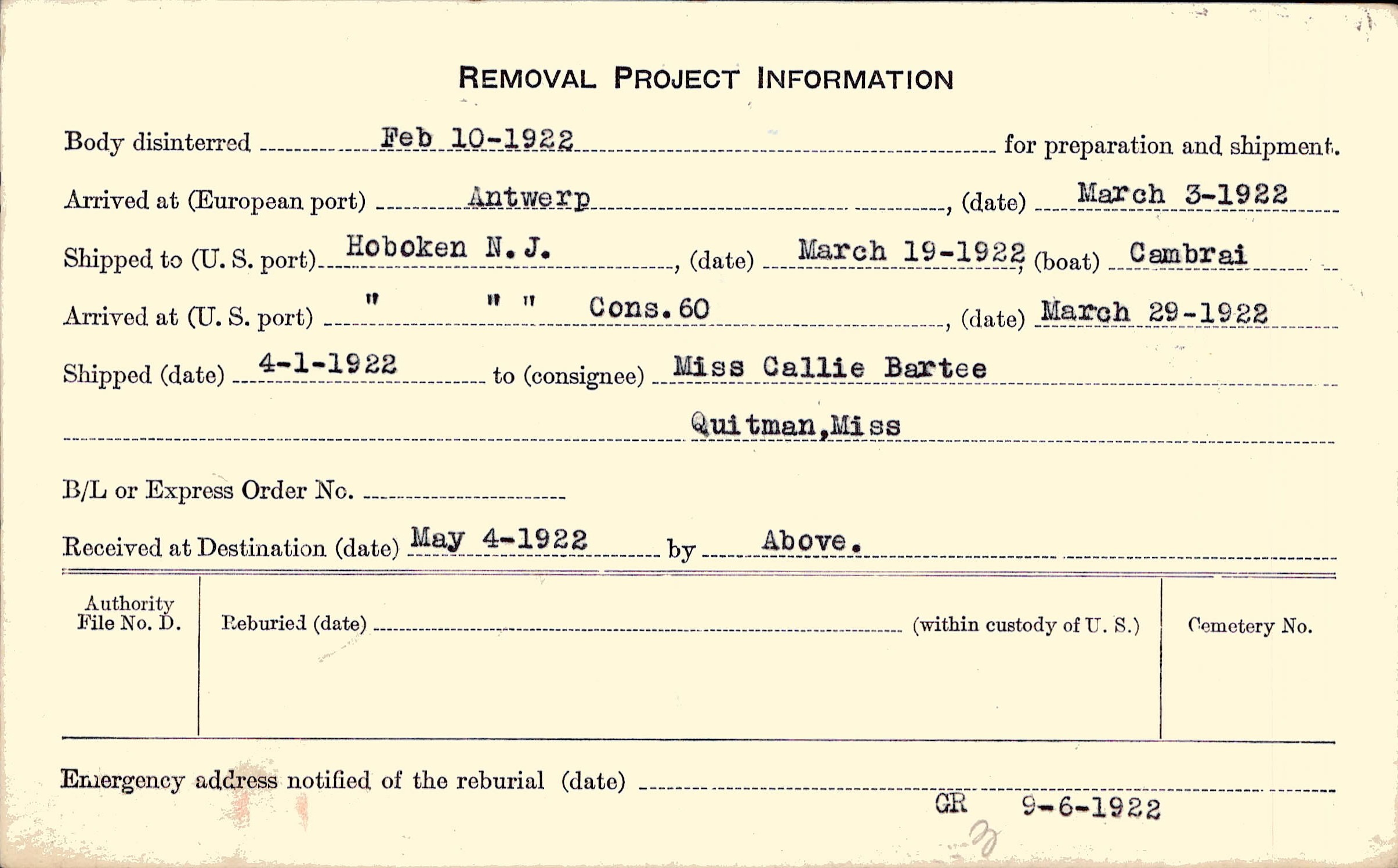 Body disinterred 2/10/1922 for preparation and shipment.