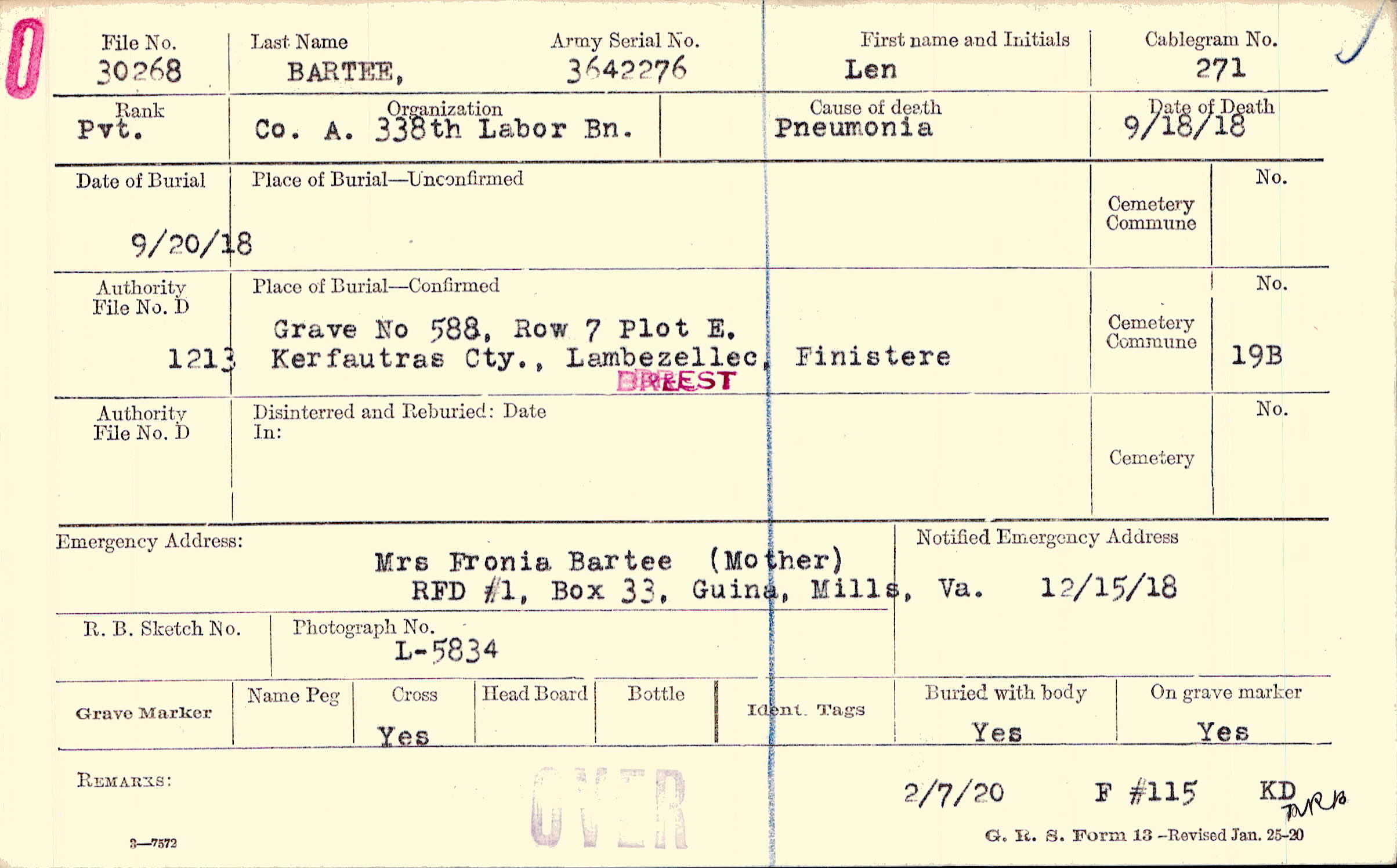 Mrs Fronia Bartee (Mother), RFD #1, Box 33, Guina, Mills, Va.