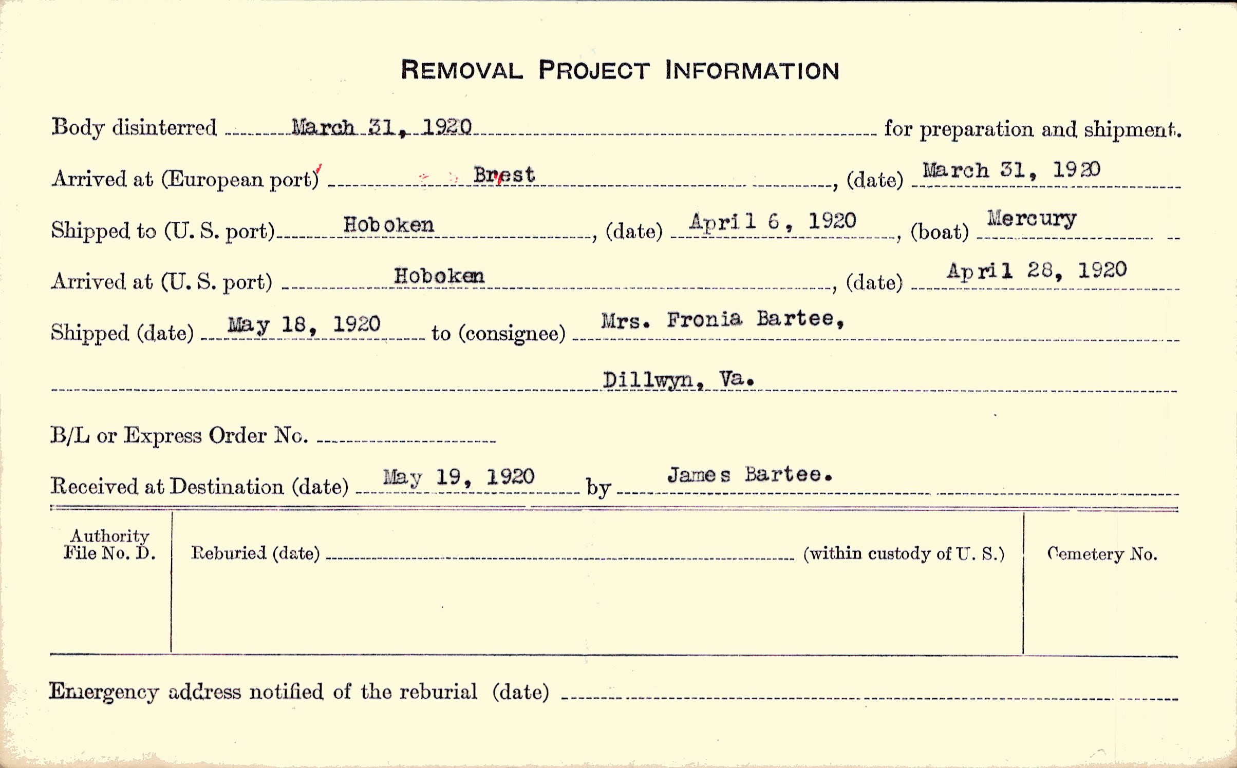 Body disinterred 3/31/1920 for preparation and shipment.