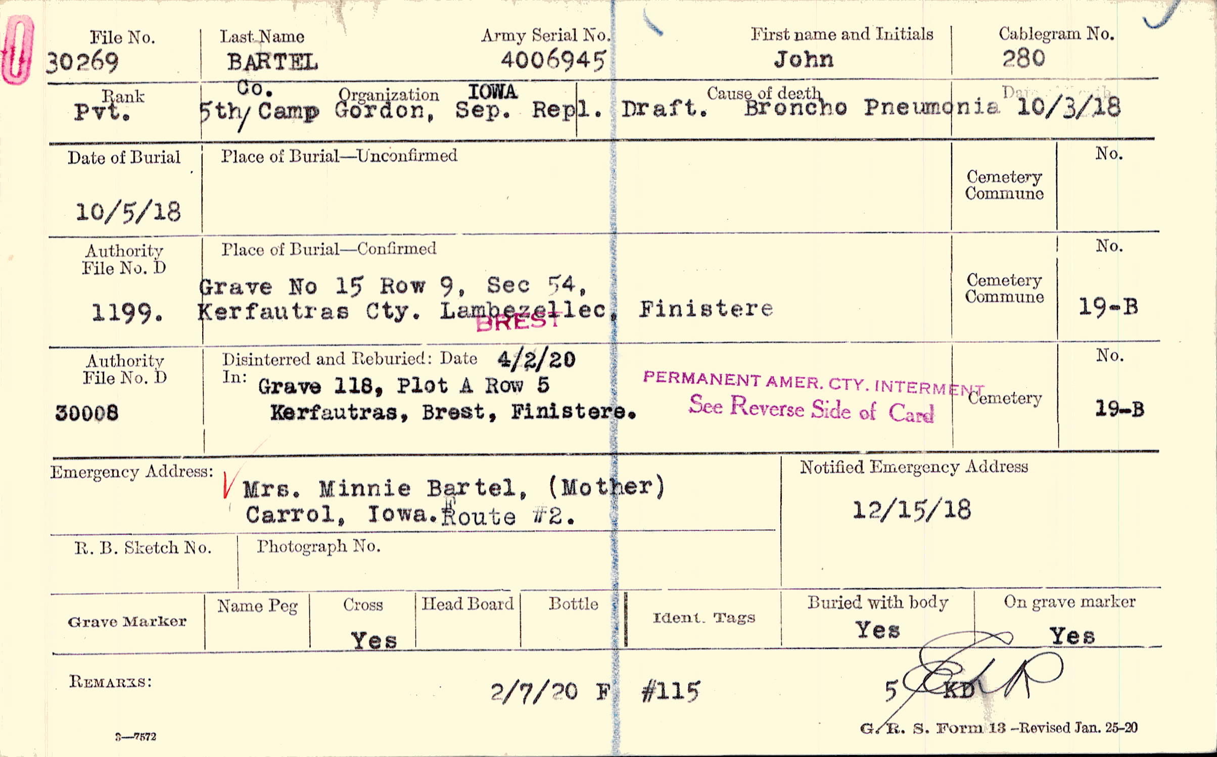 Mrs. Minnie Bartel, (Mother), Carrol, Iowa. Route #2.