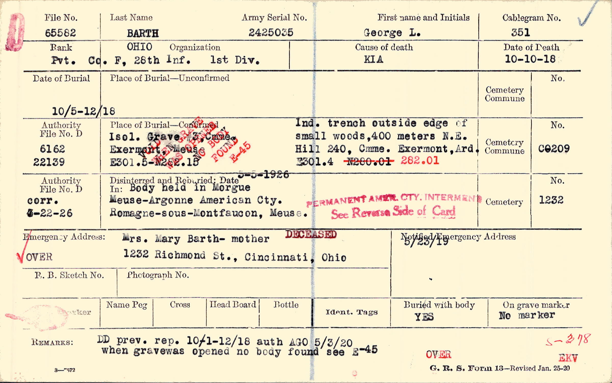Mrs. Mary Barth - mother, 1232 Richmond St., Cincinnati, Ohio, DECEASED OVER