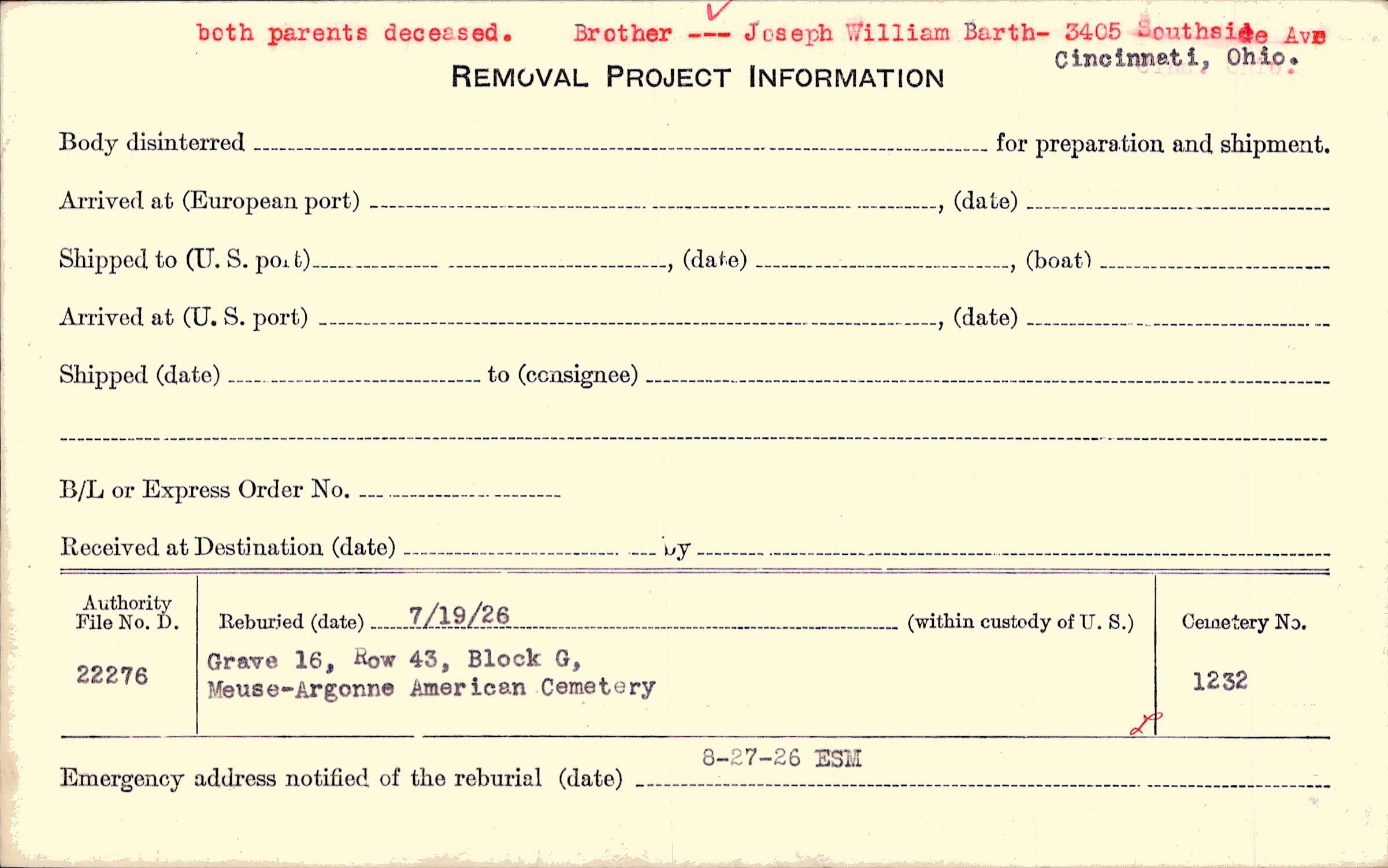 both parents deceased. Brother --- Joseph William Barth - 3405 Southside Ave., Cincinnati, Ohio. |