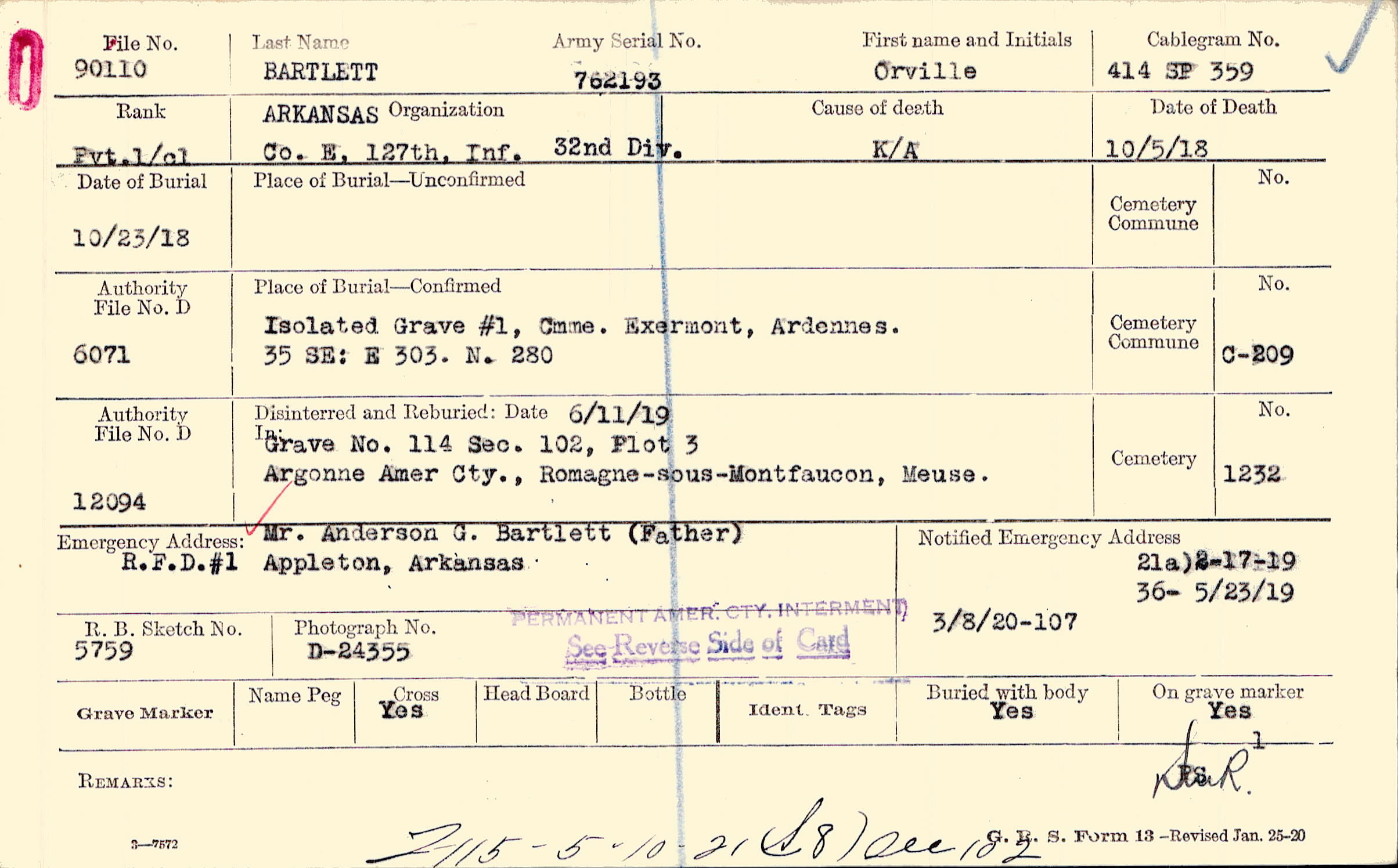 Isolated, Grave #1, Cmme., Exermont, Ardennes., 35 SE