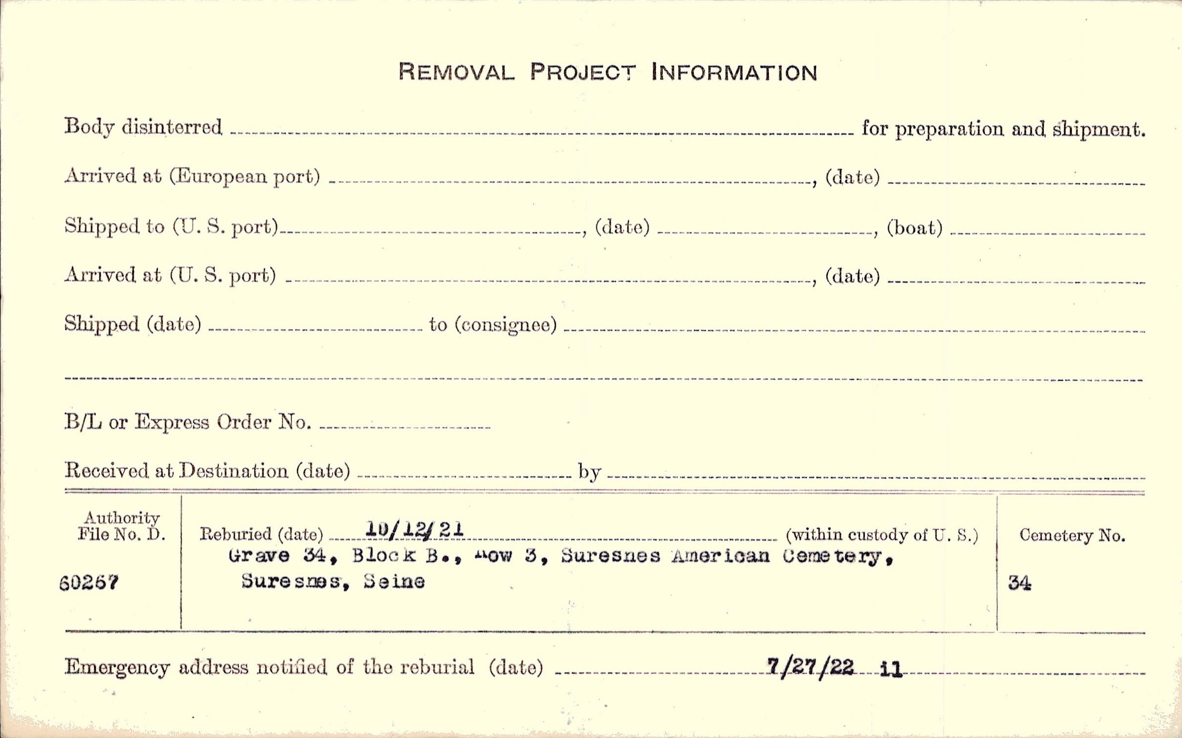 | Permanent Burial in Foreign Cemetery |