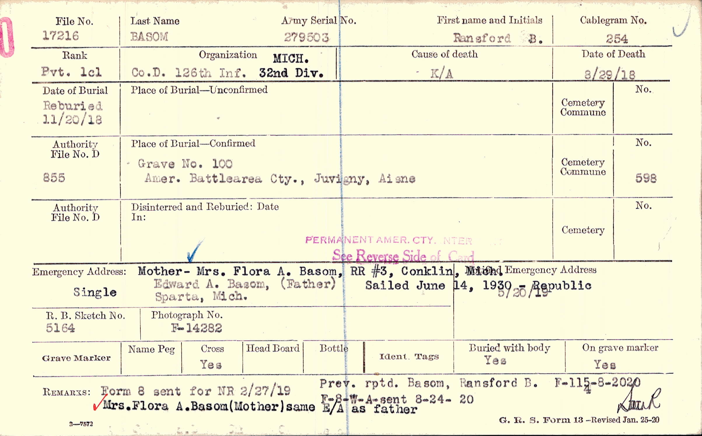 Prev. rptd. Basom, Ransford B. Mrs. Flora A. Basom (Mother) same E/A as father, Form 8 sent for NR 2/27/19 F-8-W-A sent 8-24-20, F-115-8-2020