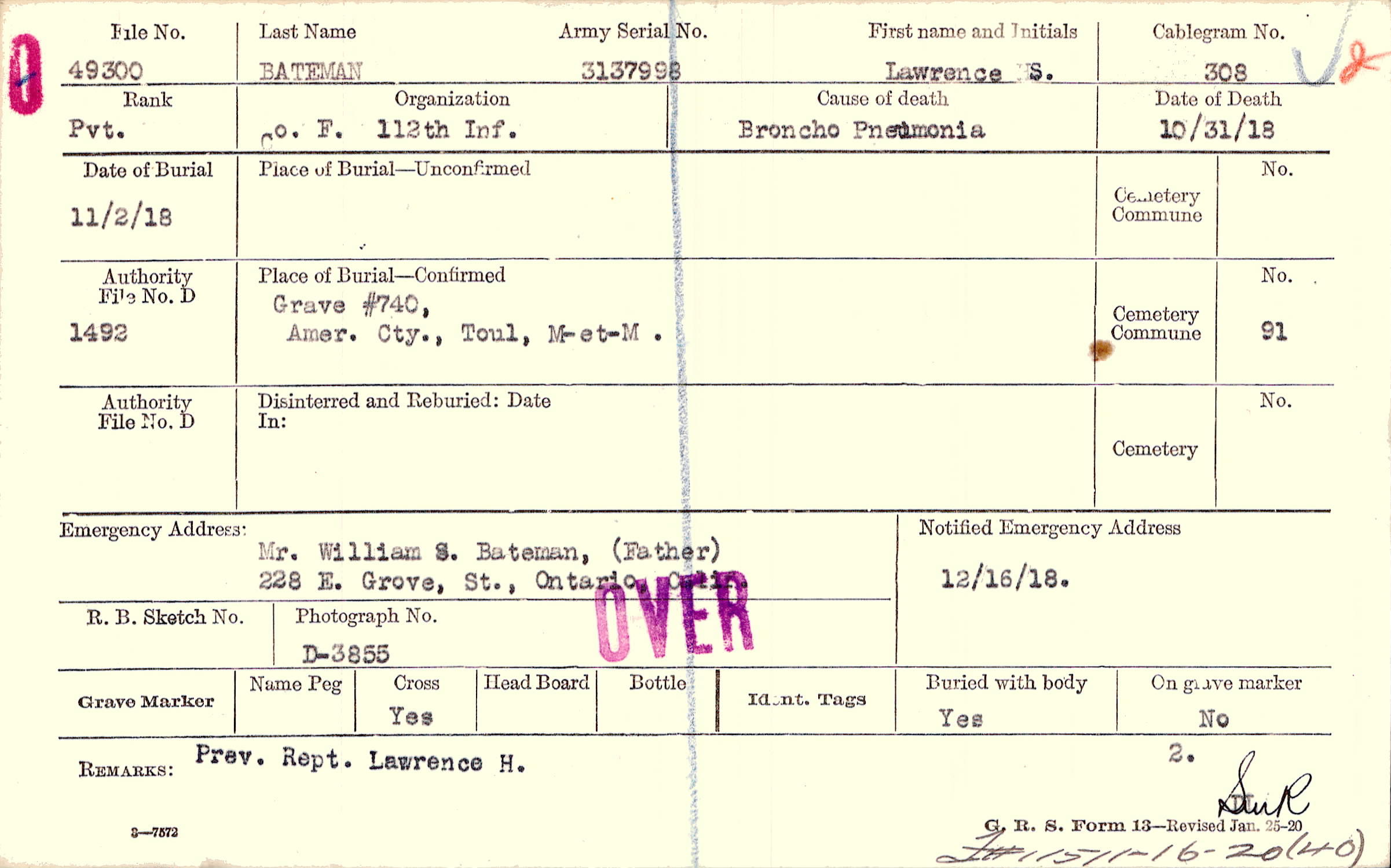 Mr. William S. Bateman, (Father), 228 E. Grove, St., Ontario, Calif., Prev. Rept. Lawrence H.