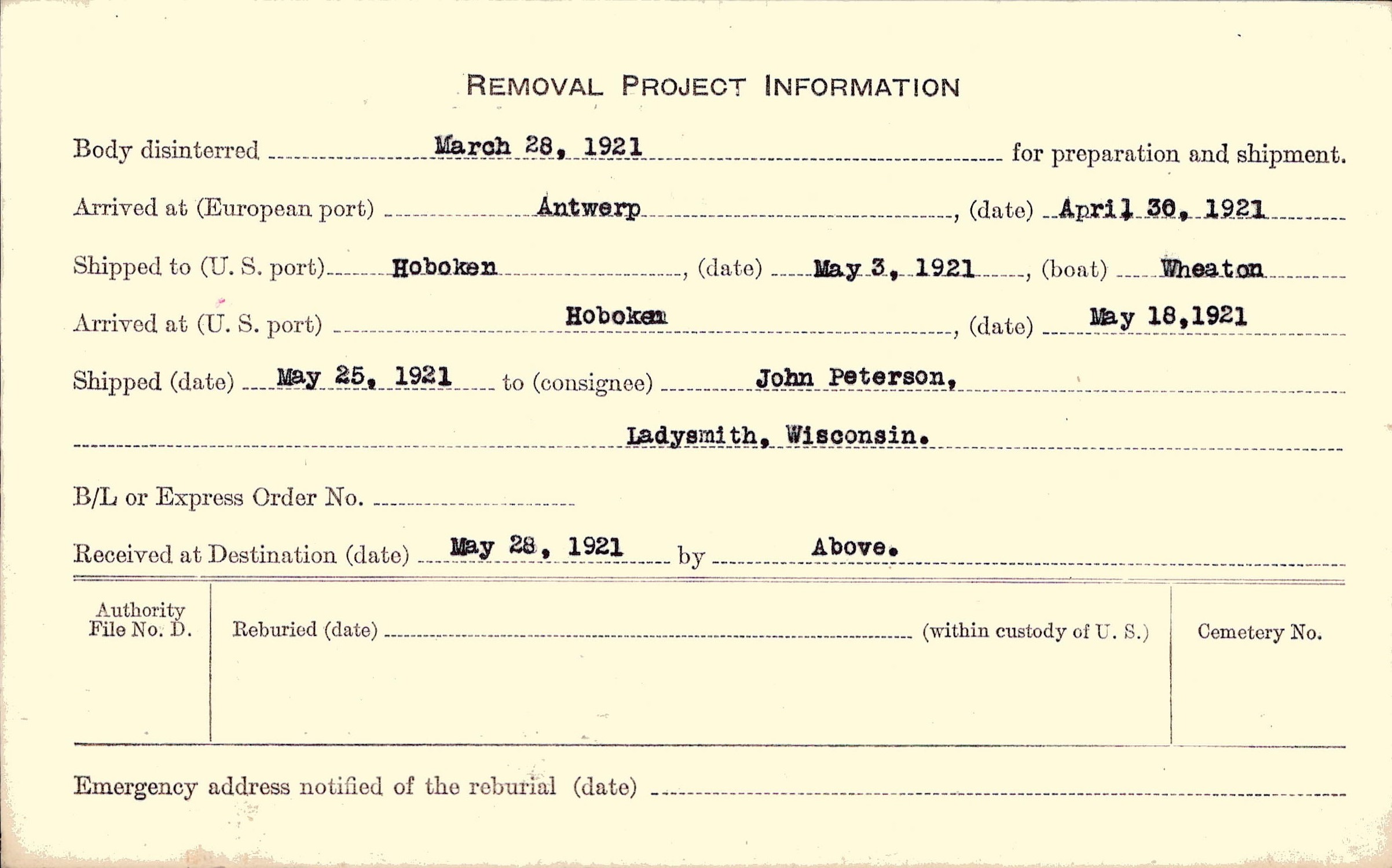 Body disinterred 3/28/1921 for preparation and shipment.