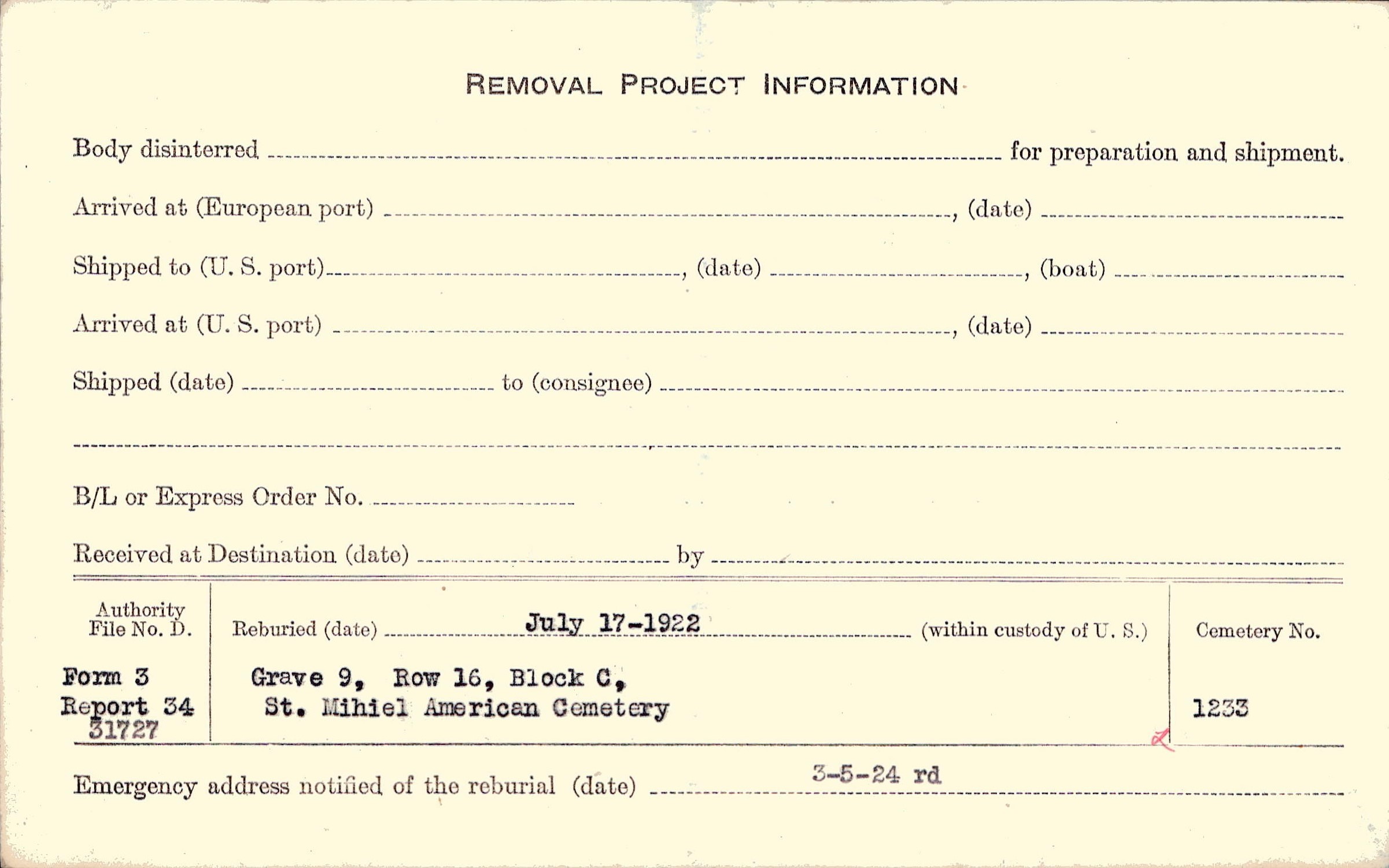 | Permanent Burial in Foreign Cemetery |