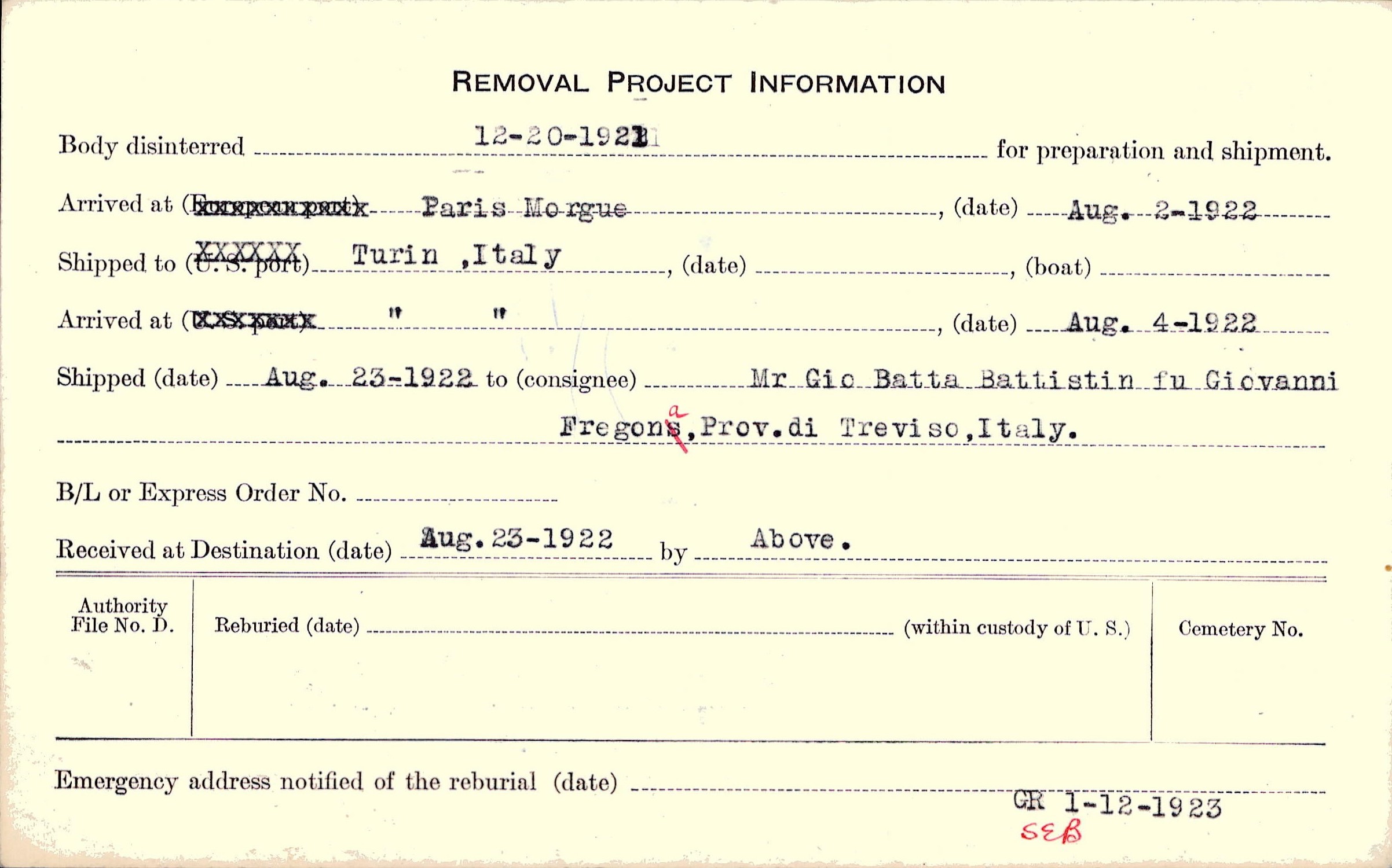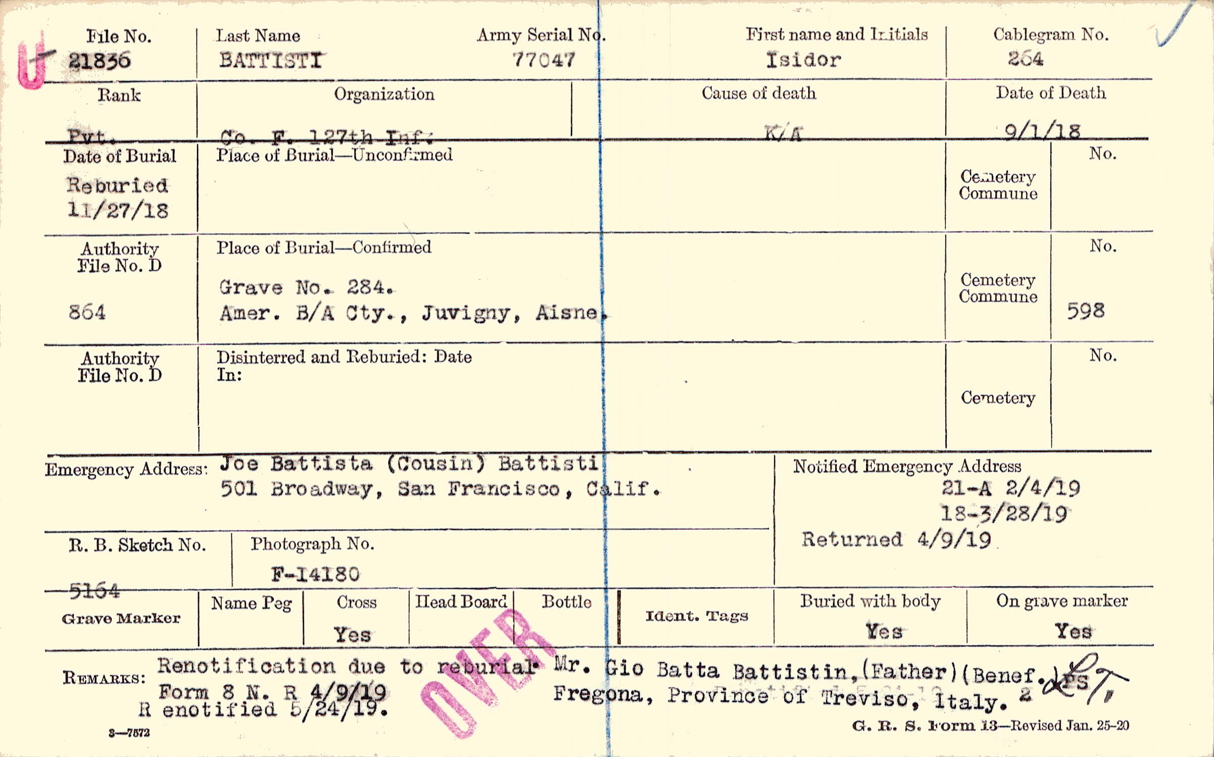 Renotification due to reburial. Mr Gio Batta Battistin, (Father) (Benef.) Fregona, Province of Treviso, Italy. Renotified 5/24/19, Form 8 N. R 4/9/19