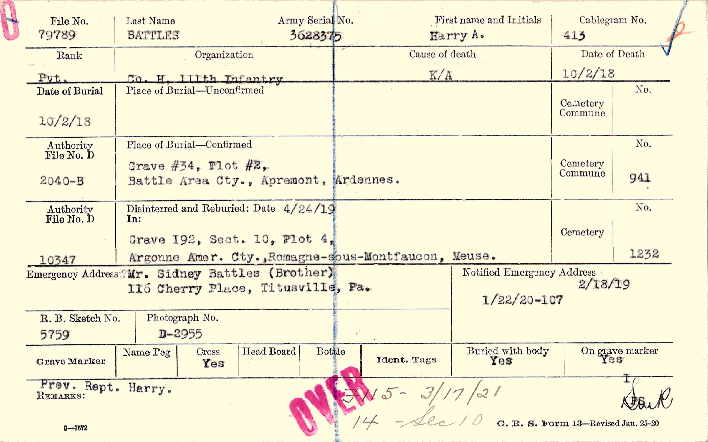 Mr. Sidney Battles (Brother), 116 Cherry Place, Titusville, Pa.