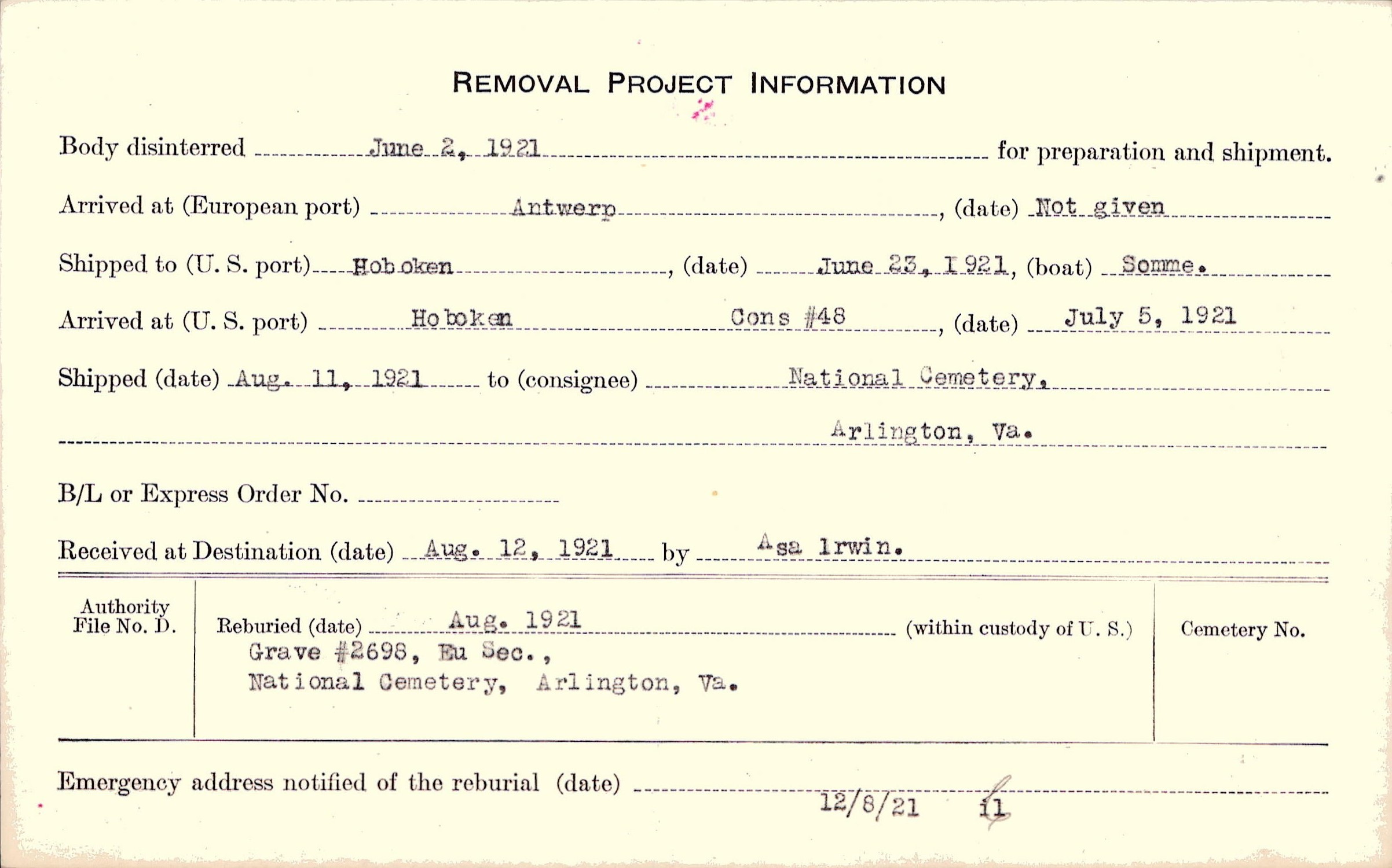 Body disinterred 6/2/1921 for preparation and shipment.