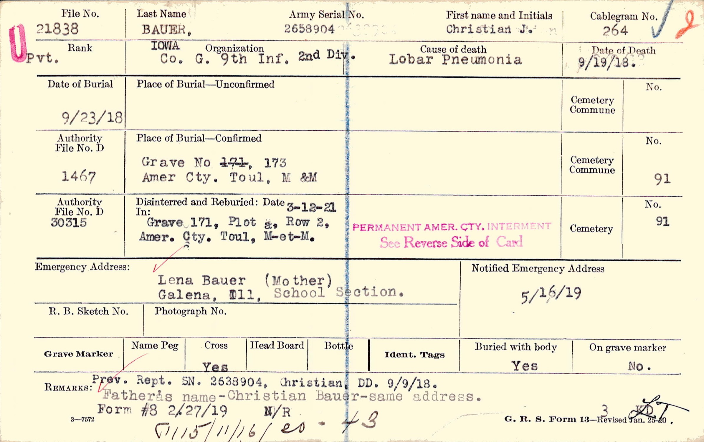 Prev. Rept. SN. 2638904, Christian, DD. 9/9/18. Father's name -Christian Bauer-same address., Form #8 2/27/19 N/R, F115 / 11/16/20 - 43