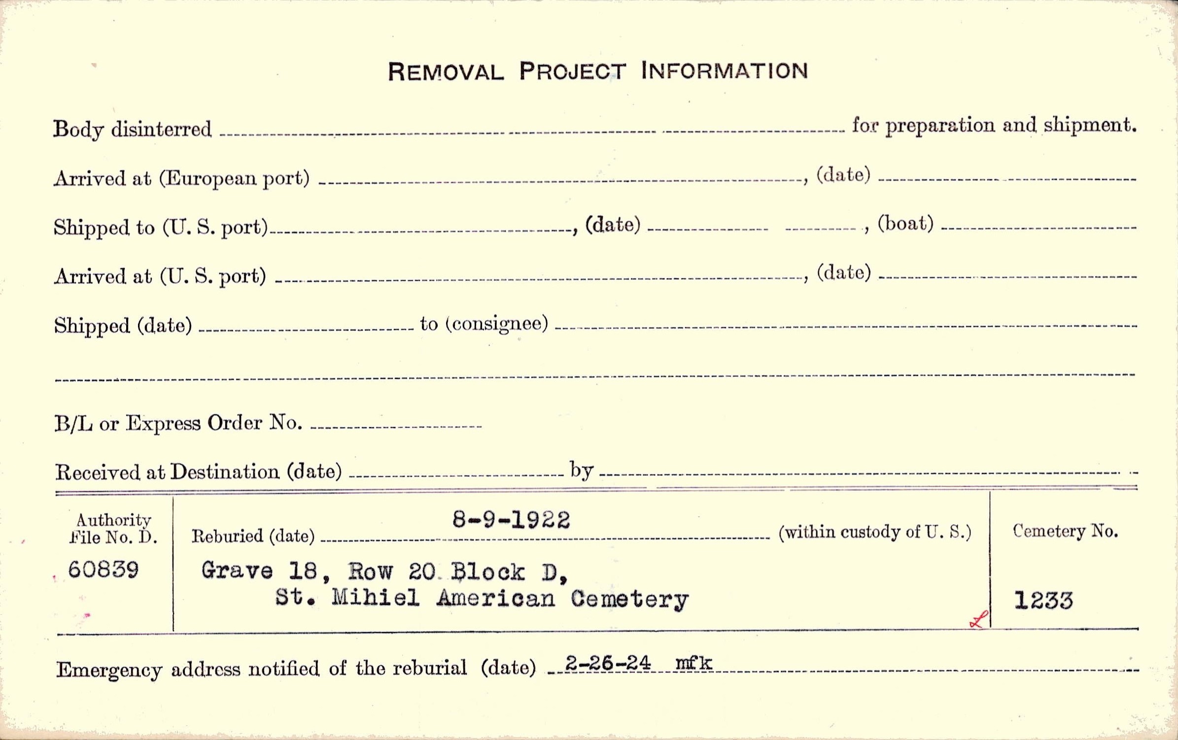 Grave 171, Row 2, Plot A, American Cemetery, Justice Hospital Group, Toul, Meurthe-et-Moselle
