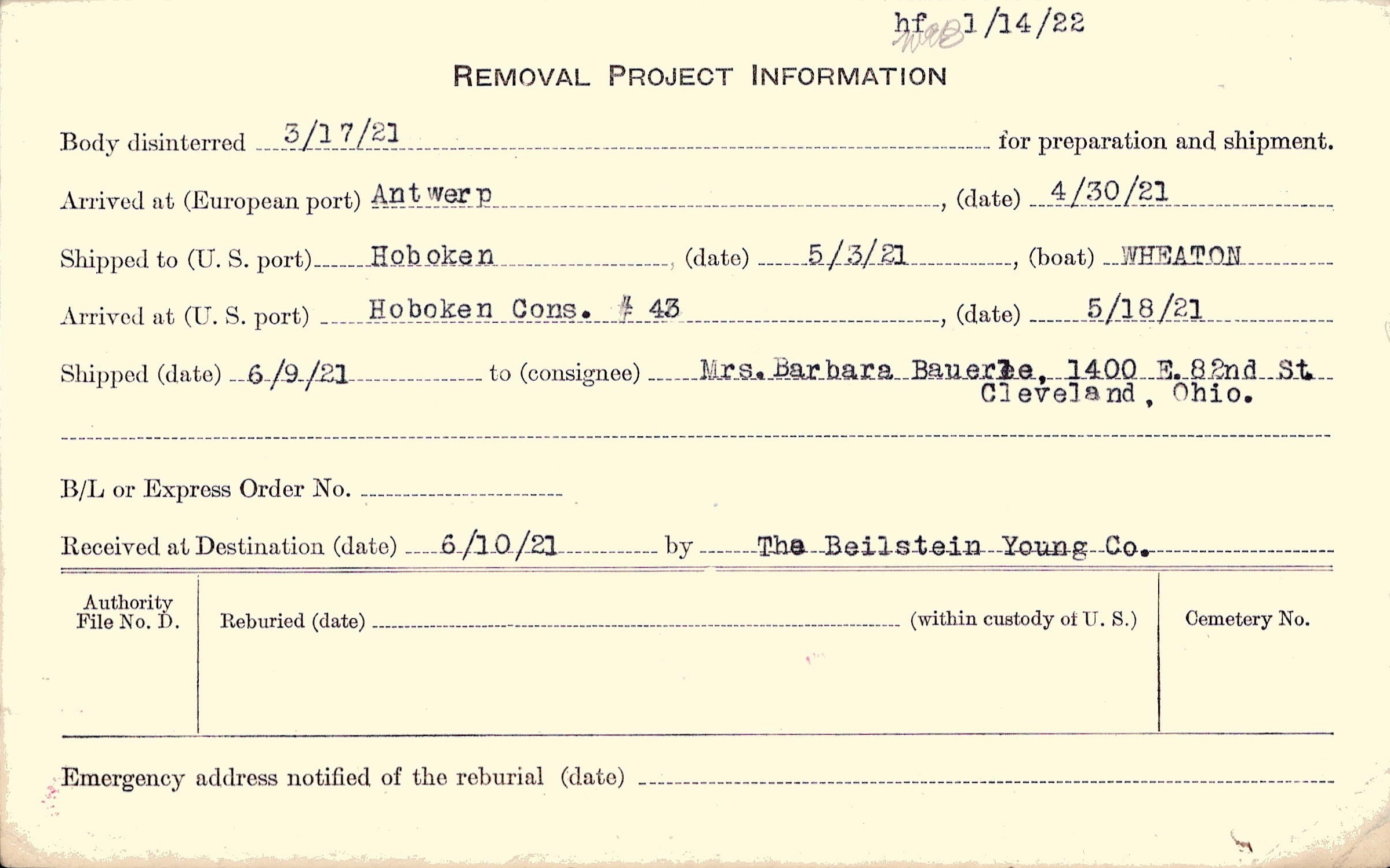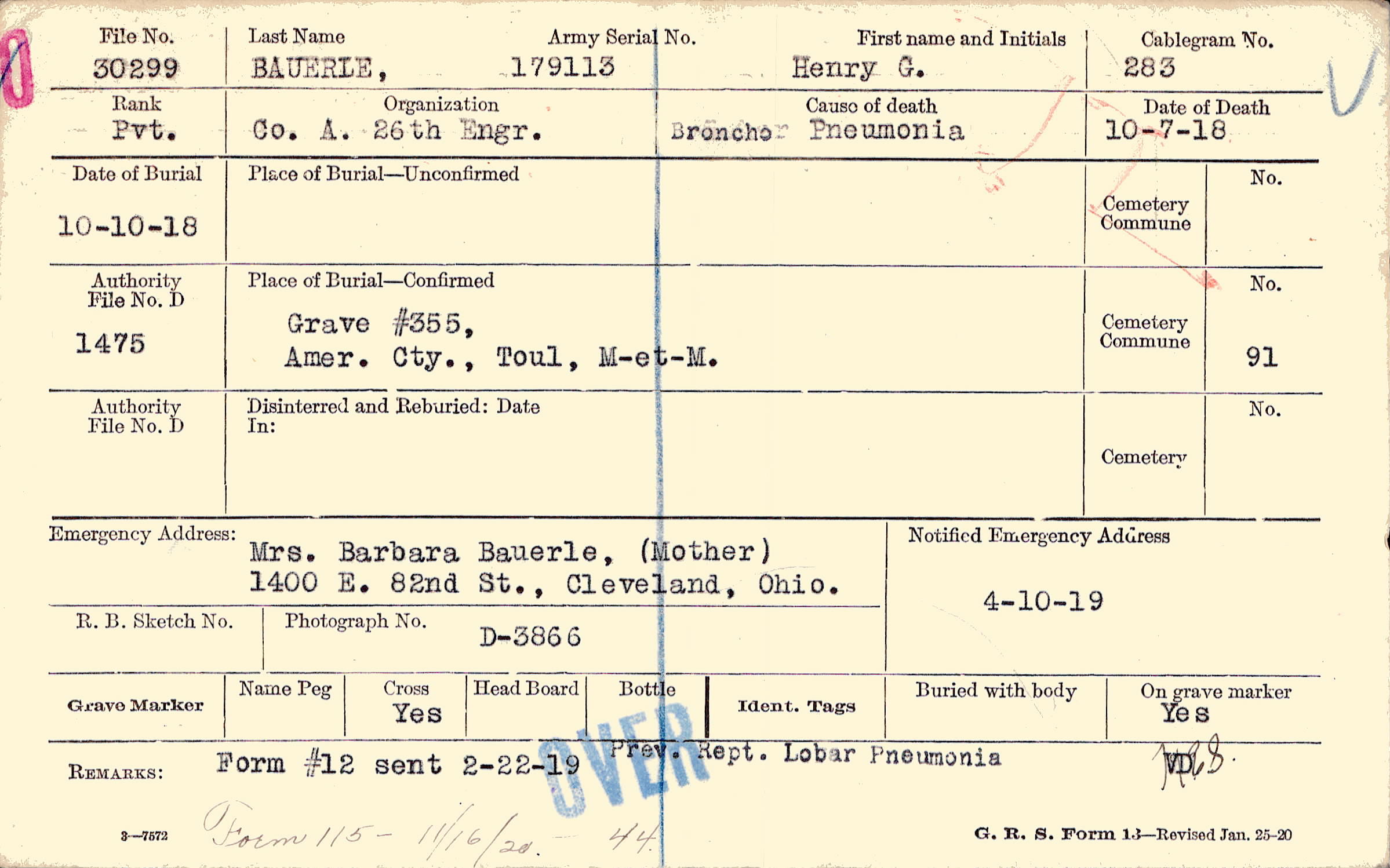 Mrs. Barbara Bauerle, (Mother), 1400 E. 82nd St., Cleveland, Ohio.