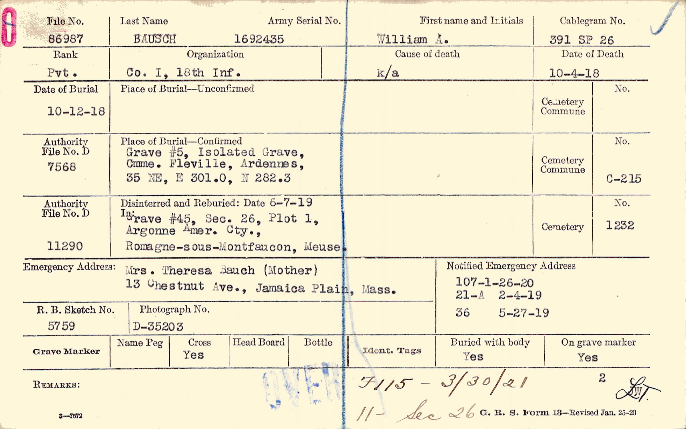 Mrs. Theresa Bauch (Mother), 13 Chestnut Ave., Jamaica Plain, Mass.