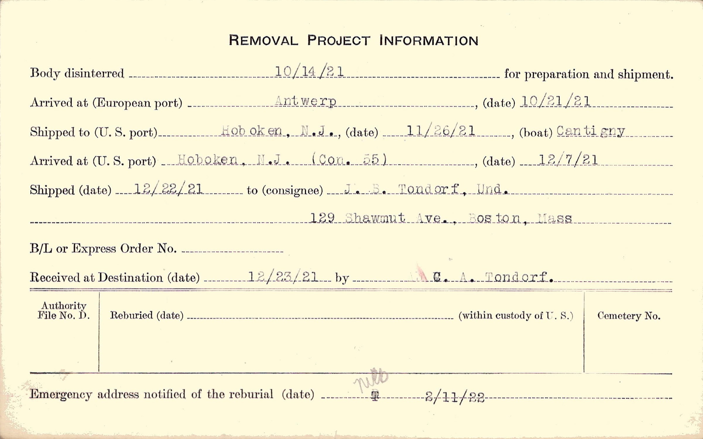to J. S. Tondorf, Und., 129 Shawmut Ave., Boston, Mass