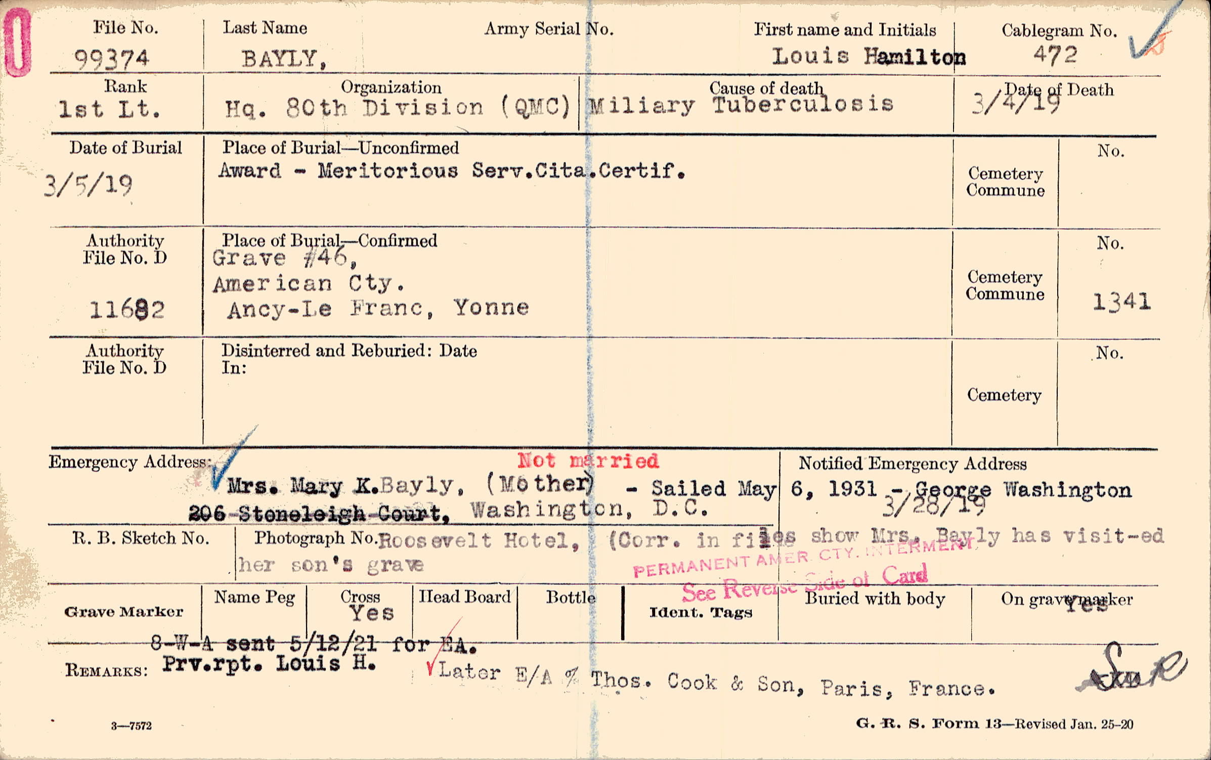 Mrs. Mary K.Bayly, (Mother), 206 Stoneleigh Court, Washington, D. C., Sailed May 6, 1931 - George Washington Roosevelt Hotel, (Corr. in files show Mrs. Bayly Has visited her son's grave. Prev. rpt. Louis H. Later E/A % Thos Cook & Son, Paris, France.