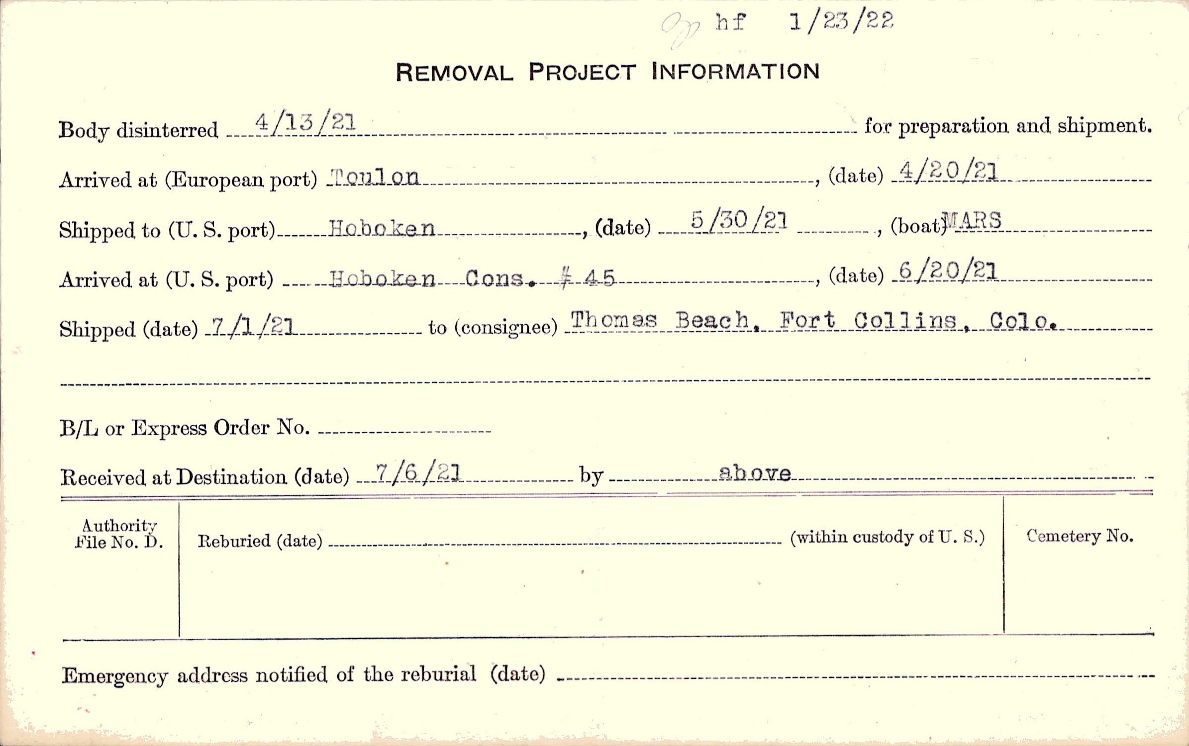Body disinterred 4/13/1921 for preparation and shipment.