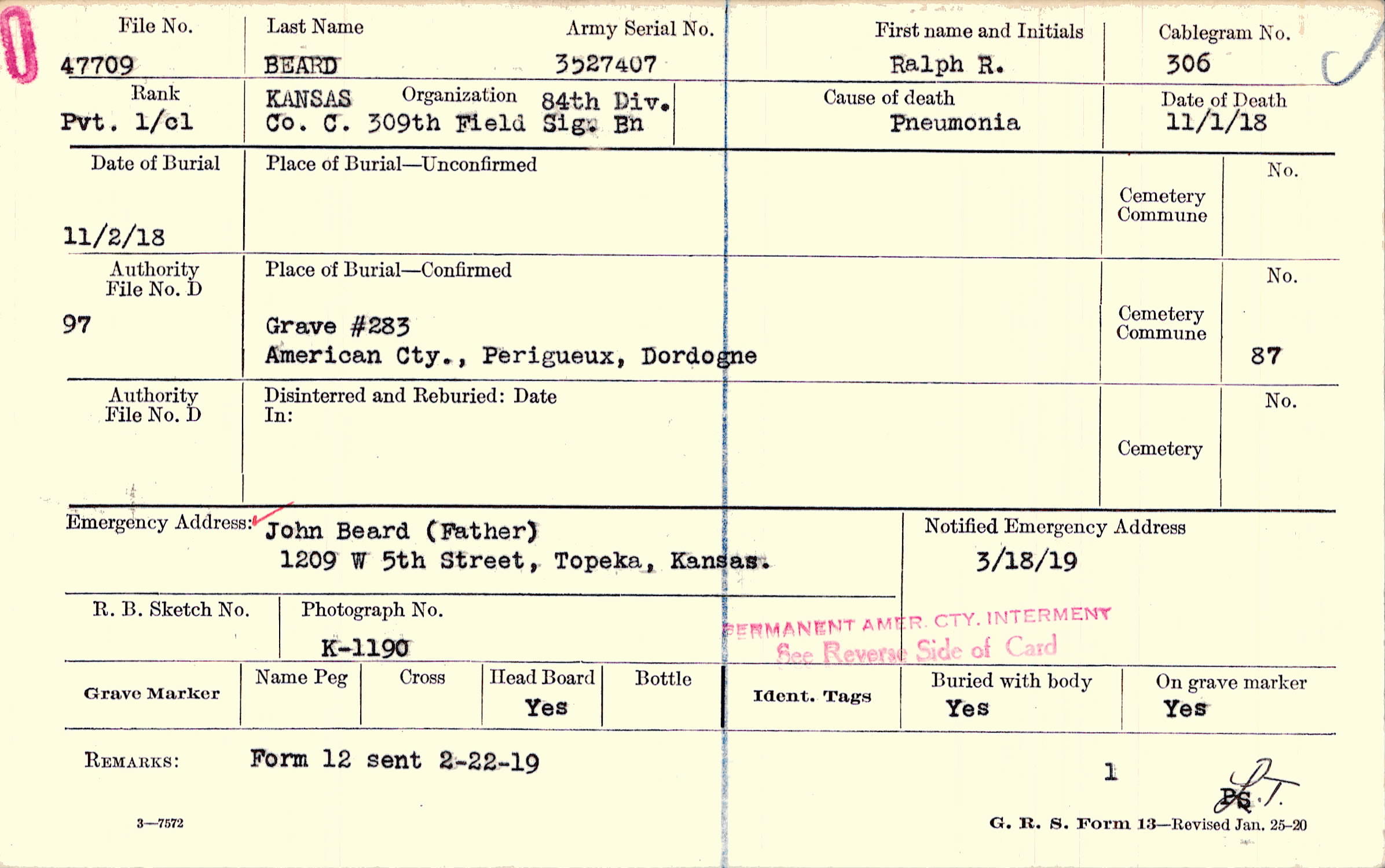 John Beard (Father), 1209 W 5th Street, Topeka, Kansas.