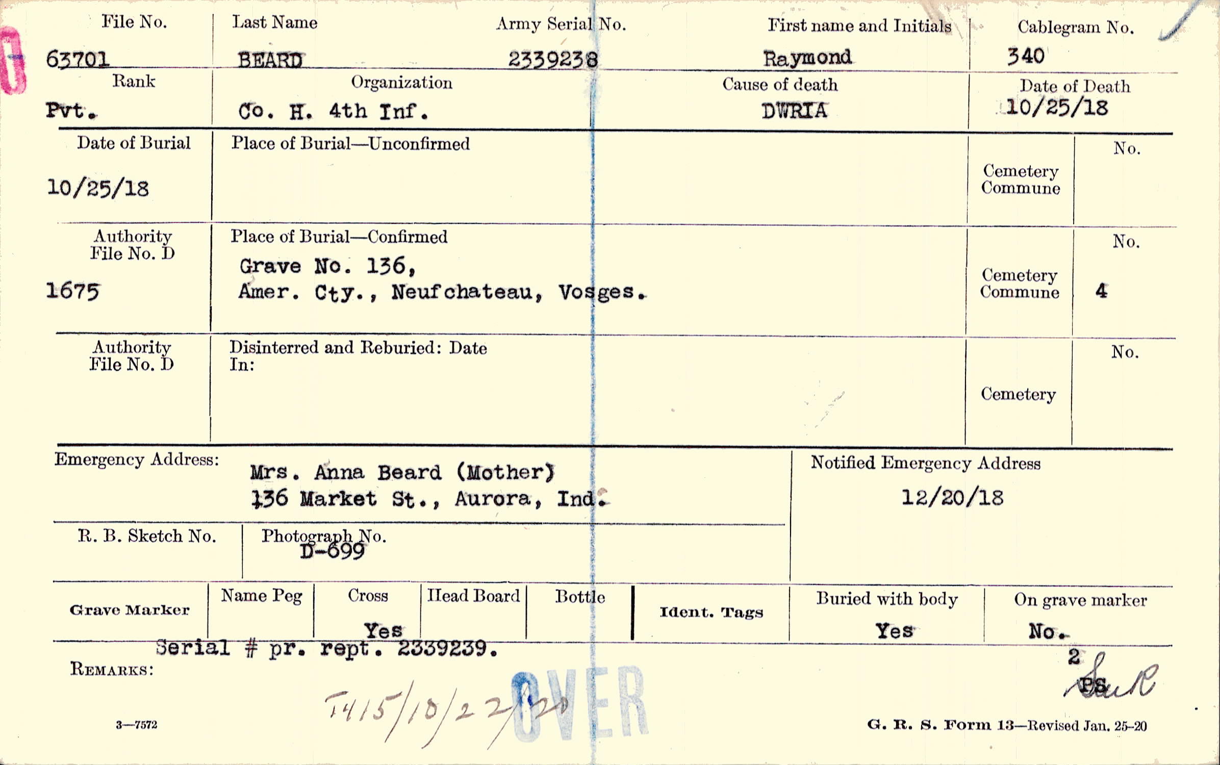 Mrs. Anna Beard (Mother), 136 Market St., Aurora, Ind.