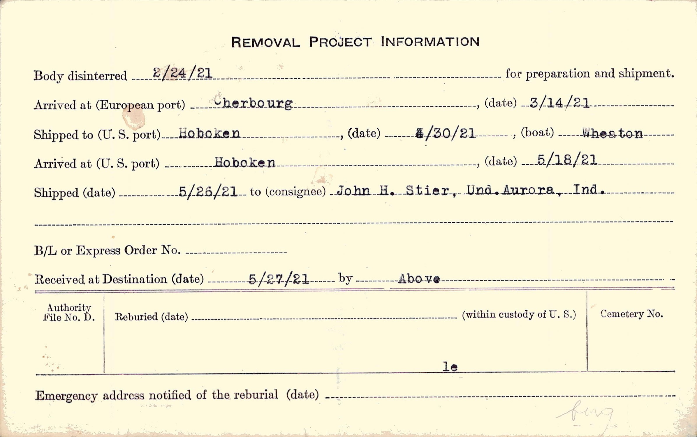 Body disinterred 2/24/1921 for preparation and shipment.