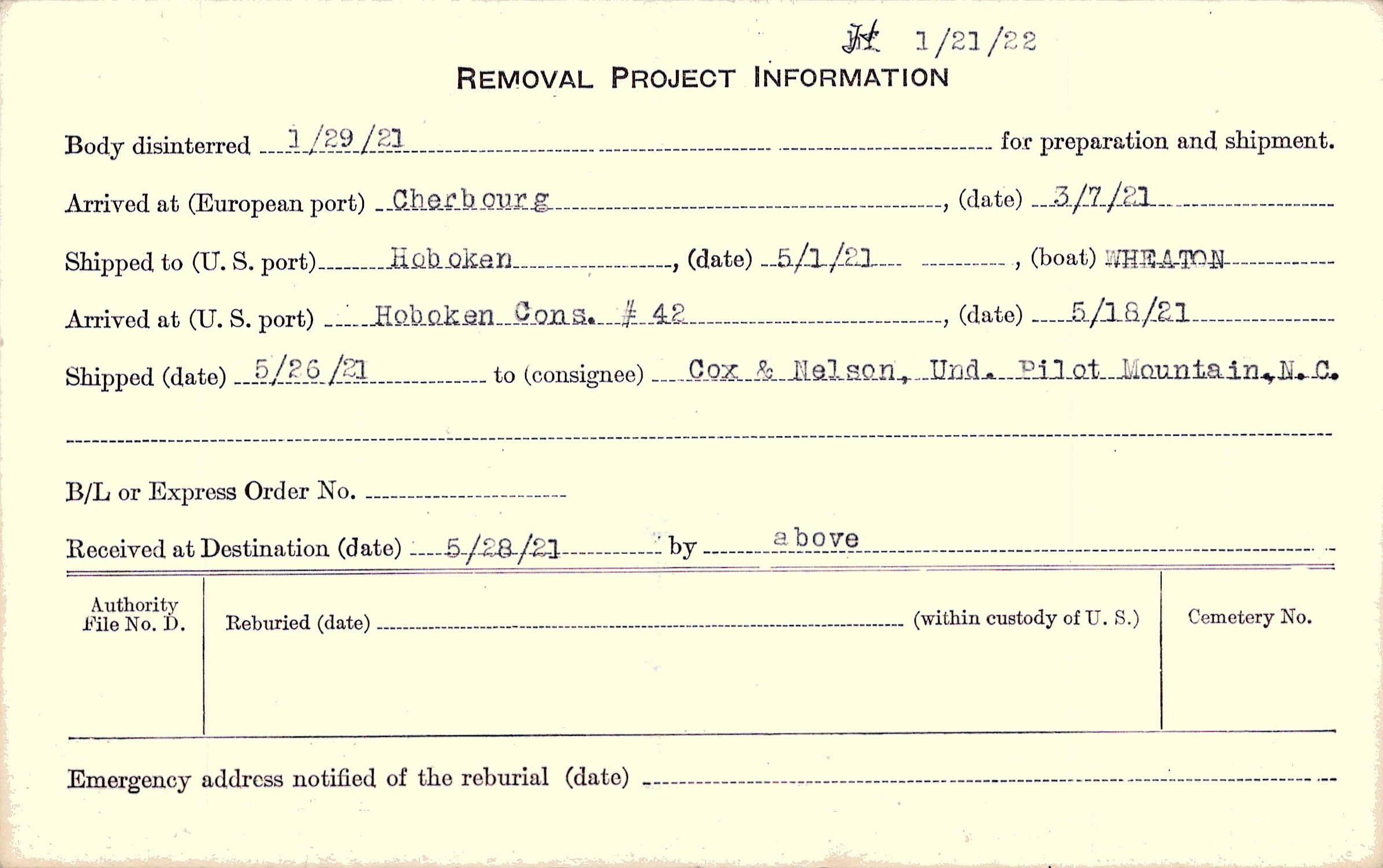 Body disinterred 1/29/1921 for preparation and shipment.