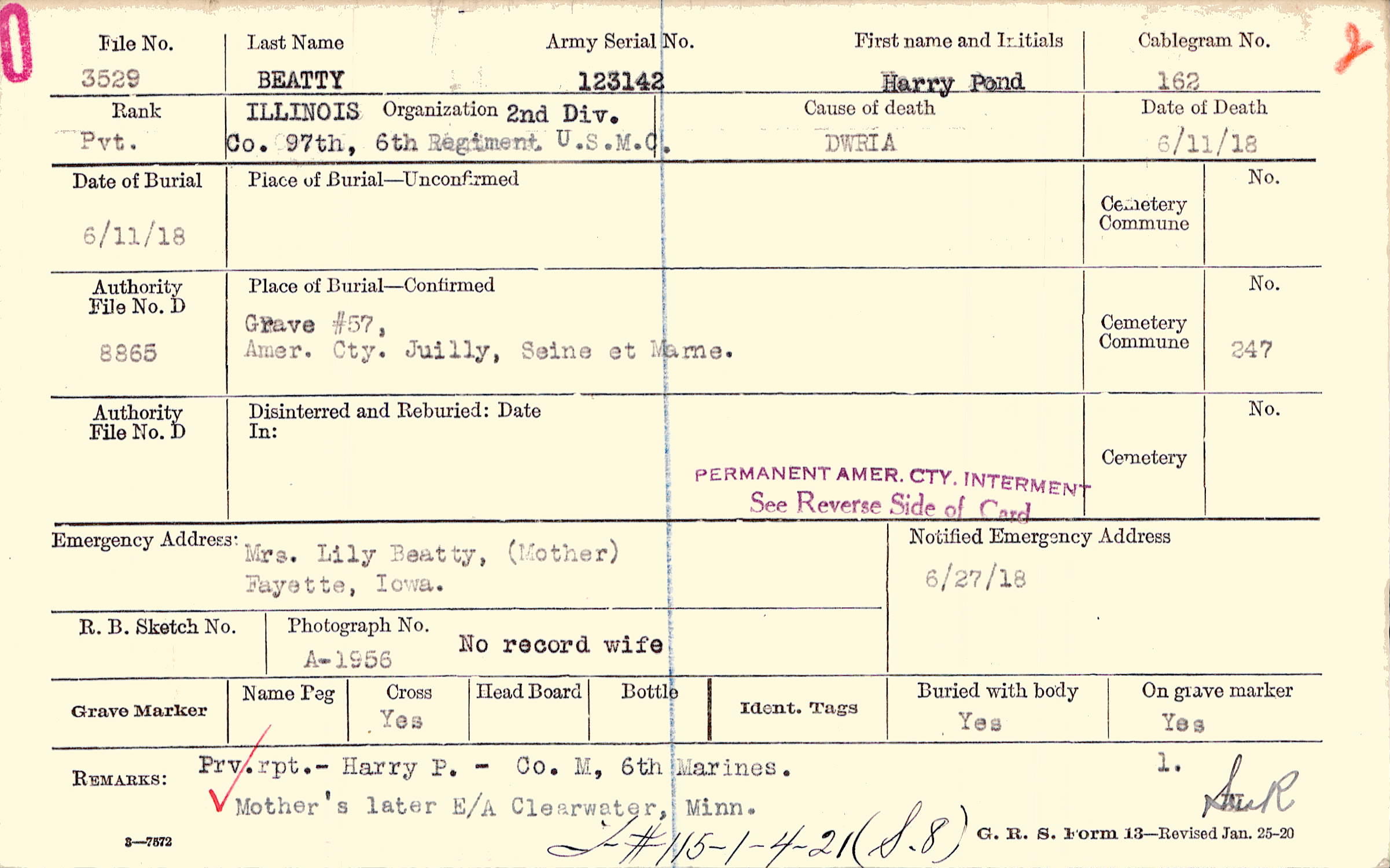 Prv. rpt.- Harry P. - Co. M, 6th Marines. Mother's later E/A Clearwater, Minn., F#115-1-4-21 (S.8)