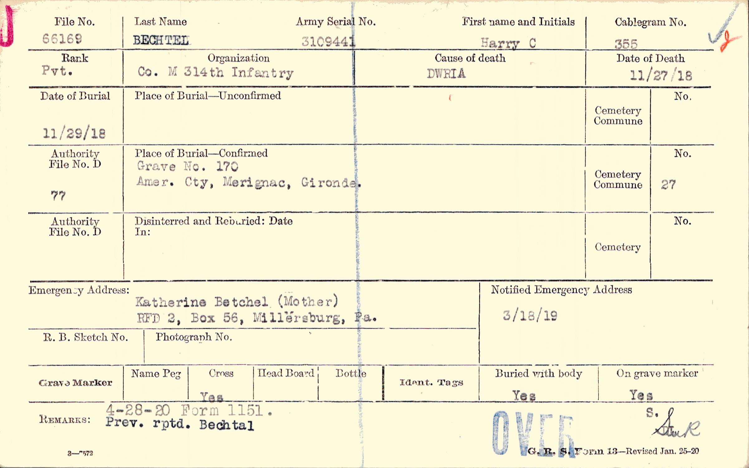 Katherine Betchel (Mother), RFD 2, Box 56, Millersburg, Pa.