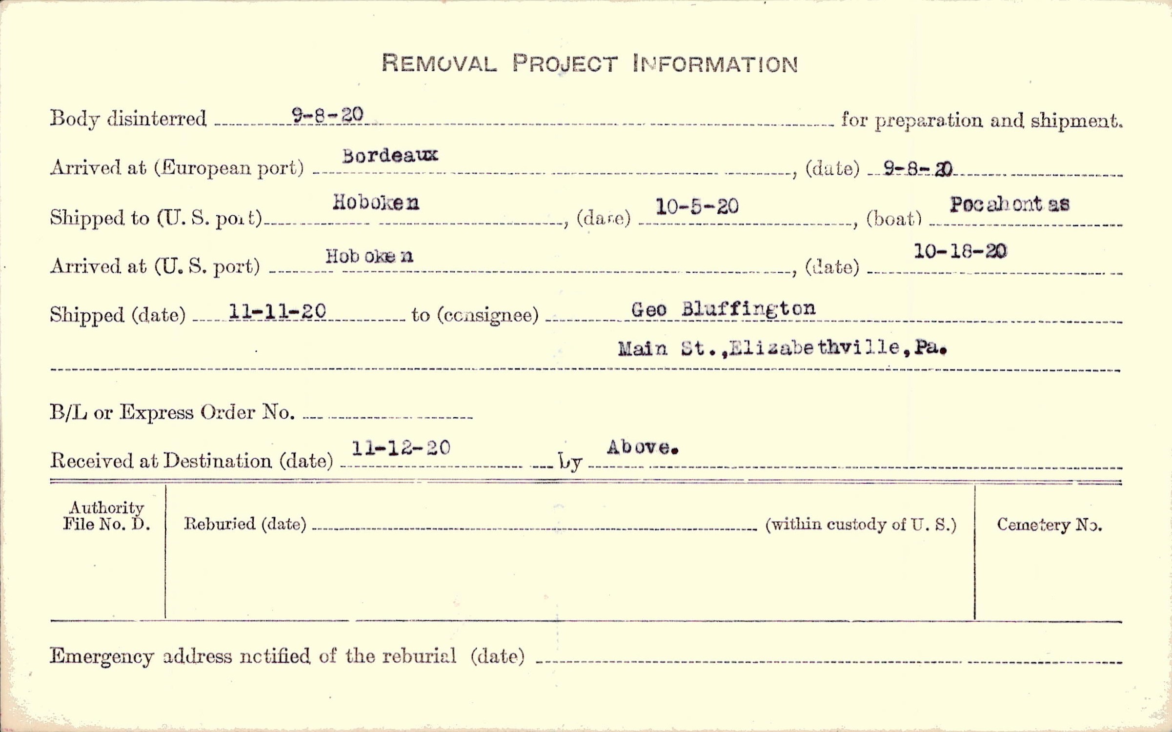 to Geo Bluffington, Main St., Elizabethville, Pa.