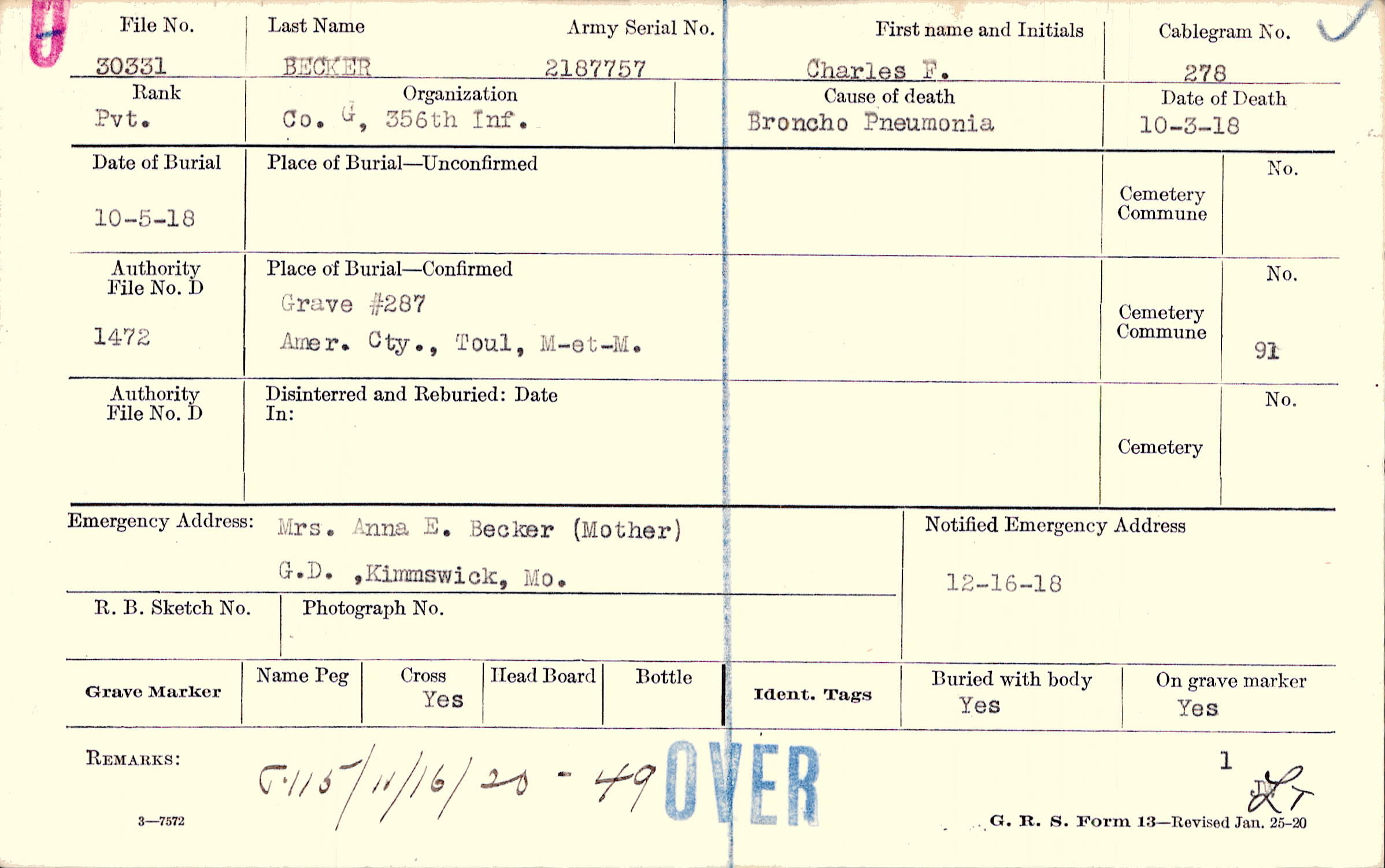 Mrs. Anna E. Becker (Mother), G. D. , Kimmswick, Mo., G.D. , Kimmswick, Mo.