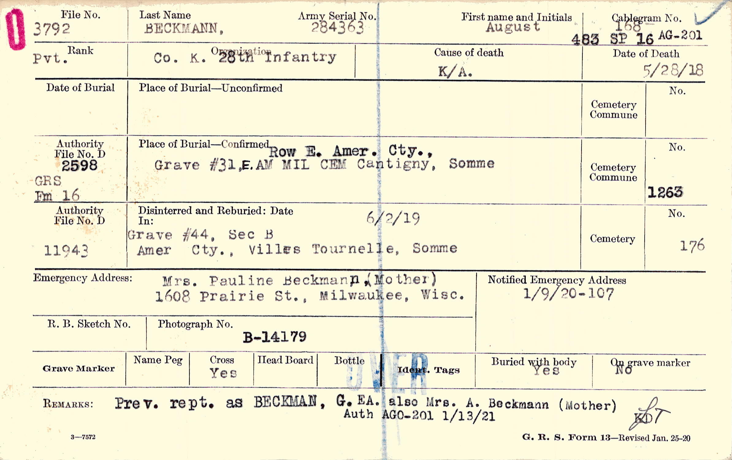Prev. rept. as BECKMAN, G. EA. also Mrs. A. Beckmann (Mother), Auth AGO-201 1/13/21, Prev. rept. as BECKMAN, G.