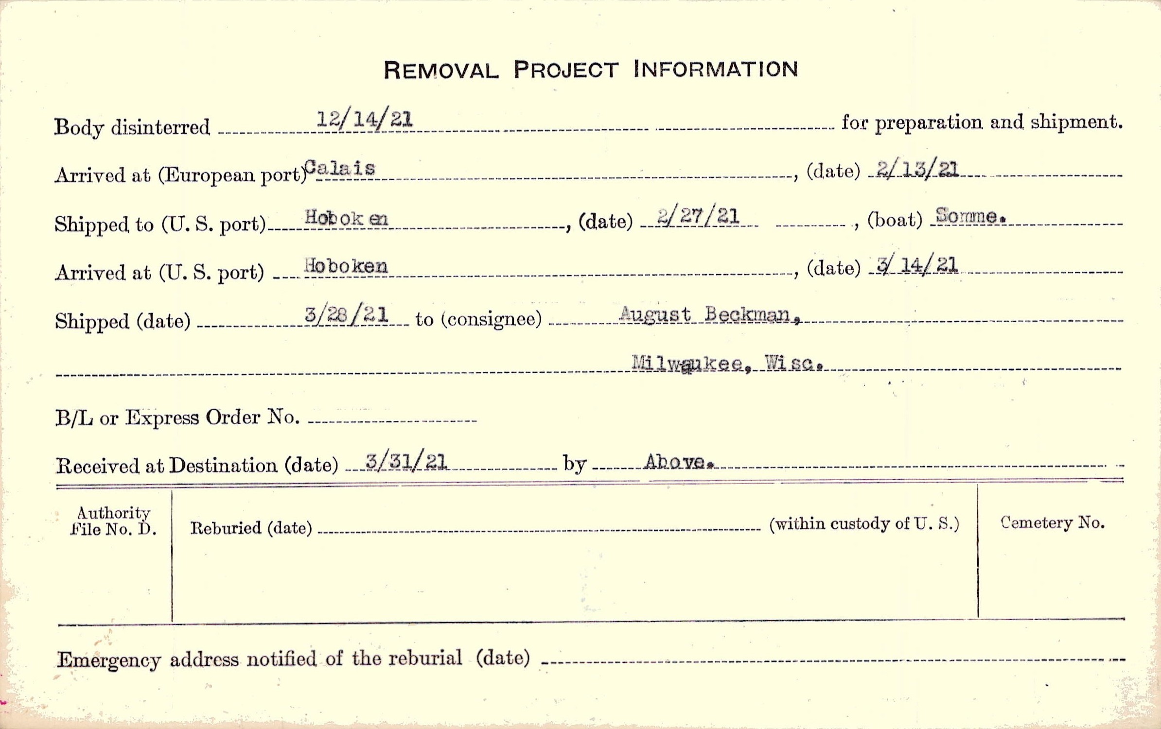 Body disinterred 12/14/1921 for preparation and shipment.