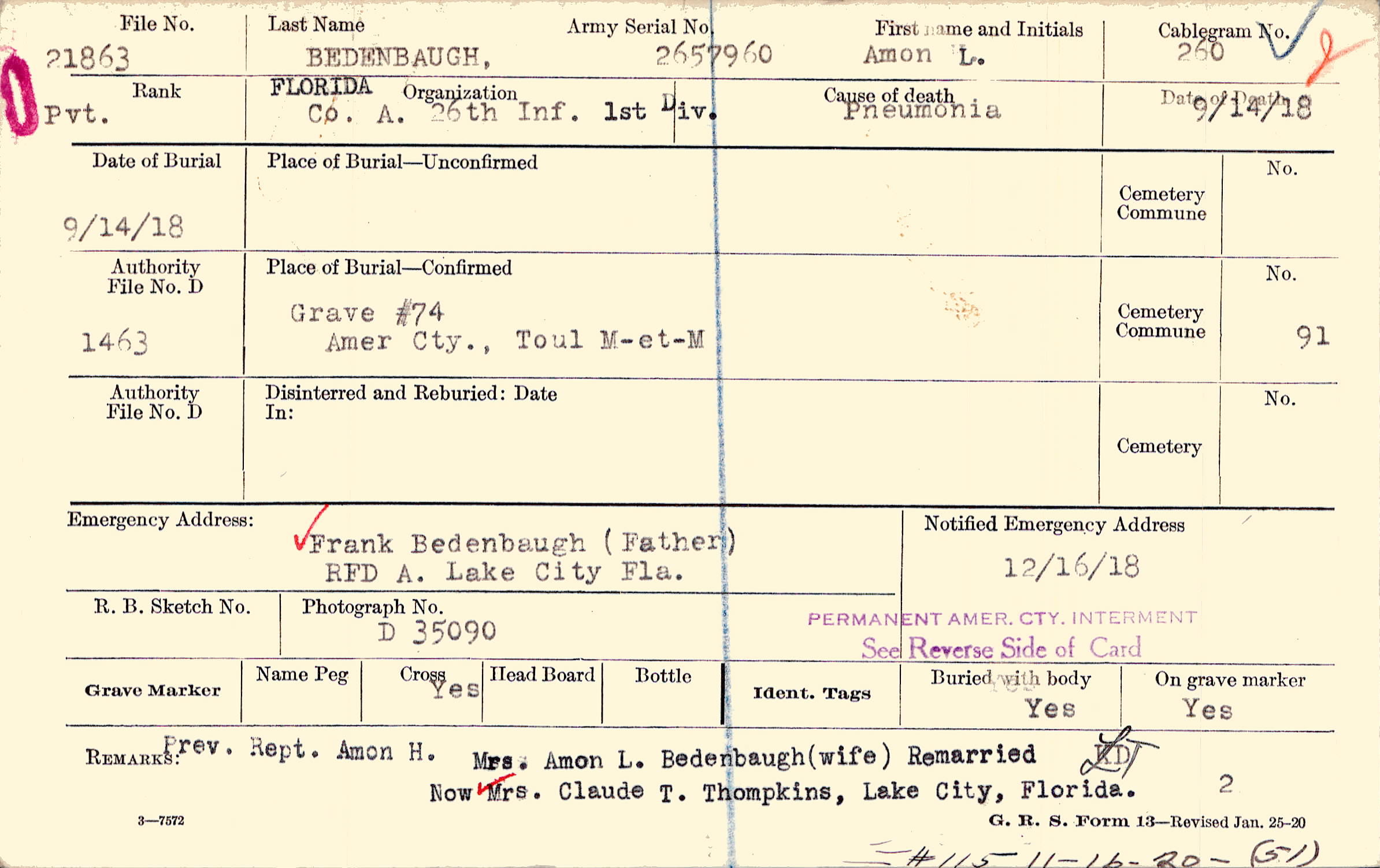 Prev. Rept. Amon H. Mrs. Amon L. Bedenbaugh (wife) Remarried Now Mrs. Claude T. Thompkins, Lake City, Florida., F#115 - 11-16-20 - (51)