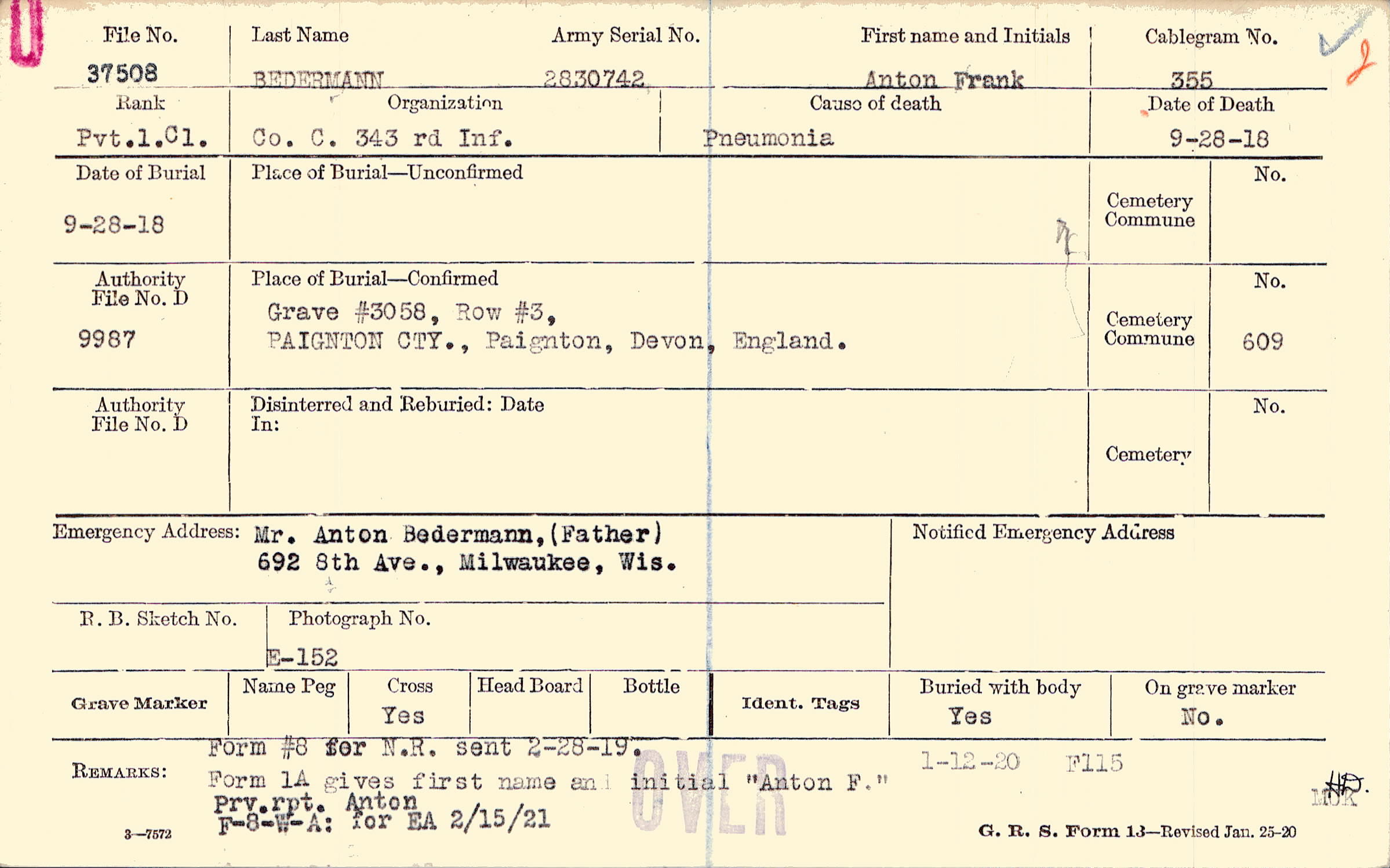 Mr. Anton Bedermann, (Father), 692 8th Ave., Milwaukee, Wis.