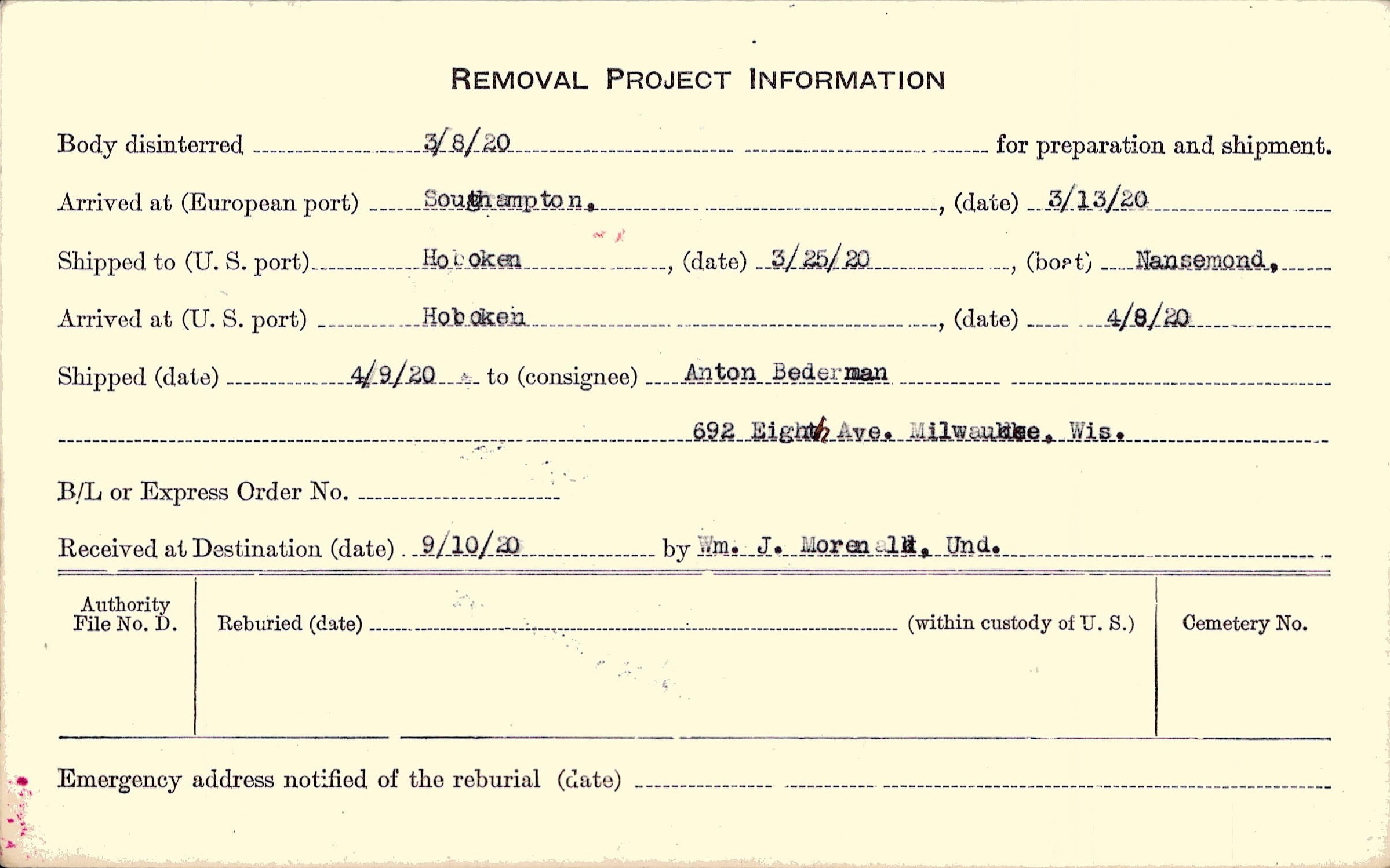 Body disinterred 3/8/1920 for preparation and shipment.